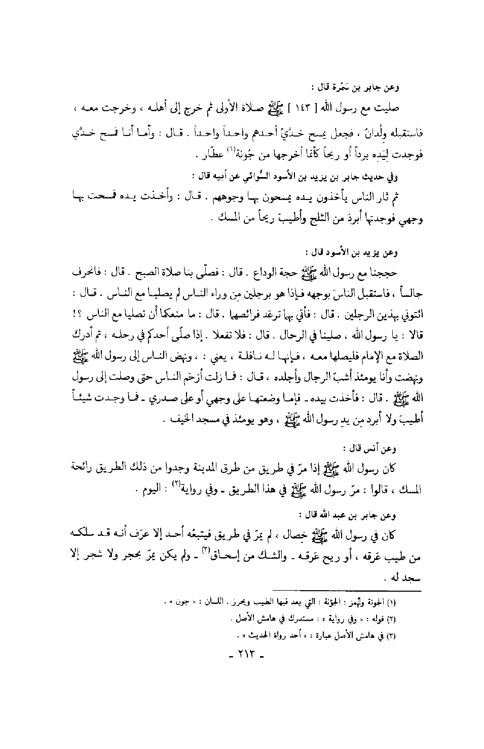 وعن جابر بن سمرة قال: صليت مع رسول الله صَلَّى اللهُ عَلَيْهِ وَسَلَّمَ صلاة الأولى ثم خرج إلى أهله، وخرجت معه، فاستقبله ولدانٌ، فجعل يمسح خدي أحدهم واحداً واحداً. قال: وما أنا فمسح خدي فوجدت ليده برداً أو ريحاً كأنما أخرجها من جونة عطار. وفي حديث جابر بن يزيد ين الأسود السوائي عن أبيه قال: ثم ثار الناس يأخذون يده يمسحون بها وجوههم. قال: وأخذت يده فمسحت بها وجهي فوجدتها أبرد من الثلج وأطيب ريحاً من المسك. وعن يزيد بن الأسود قال: حججنا مع رسول الله صَلَّى اللهُ عَلَيْهِ وَسَلَّمَ حجة الوداع. قال: فصلى بنا صلاة الصبح. قال: فانحرف جالساً، فاستقبل الناس بوجهه فإذا هو برجلين من وراء الناس لم يصليا مع الناس. قال: ائتوني بهذين الرجلين. قال: فأتي بهما ترعد فرائصهما. قال: ما منعكما أن تصليا مع الناس؟! قالا: يا رسول الله، صلينا في الرحال. قال: فلا تفعلا. إذا أحدكم في رحله، ثم أدرك الصلاة مع الإمام فليصلها معه، فإنها له نافلة، يعني: ونهض الناس إلى رسول الله صَلَّى اللهُ عَلَيْهِ وَسَلَّمَ ونهضت وأنا يومئذ أشبّ الرجال وأجلده، قال: فما زلت أزحم الناس حتى وصلت إلى رسول الله صَلَّى اللهُ عَلَيْهِ وَسَلَّمَ. قال: فأخذت بيده فإما وضعتها على وجهي أو على صدري فما وجدت شيئاً أطيب ولا أبرد من يد رسول الله صَلَّى اللهُ عَلَيْهِ وَسَلَّمَ، وهو يومئذ في مسجد الخيف. وعن أنس قال: كان رسول الله صَلَّى اللهُ عَلَيْهِ وَسَلَّمَ إذا مر في طريق من طرق المدينة وجدوا من ذلك الطريق رائحة المسك، قالوا: مر رسول الله صَلَّى اللهُ عَلَيْهِ وَسَلَّمَ في هذا الطرق وفي رواية: اليوم. وعن جابر بن عبد الله قال: كان رسول الله صَلَّى اللهُ عَلَيْهِ وَسَلَّمَ خصال، لم يمر في طريق فيتبعه أحد إلا عرف أنه قد سلكه من طيب عرقه، أو ريح عرقه والشك من إسحاق ولم يكن يمر بحجر ولا شجر إلا سجد له.