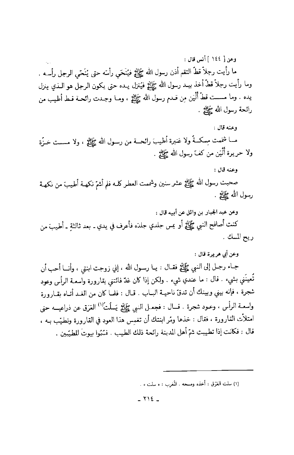 وعن أنس قال: ما رأيت رجلاً قط التقم أذن رسول الله صَلَّى اللهُ عَلَيْهِ وَسَلَّمَ فينحي رأسه حتى ينحي الرجل رأسه. وما رأيت رجلاً قط أخذ بيد رسول الله صَلَّى اللهُ عَلَيْهِ وَسَلَّمَ فيُنزل يده حتى يكون الرجل هو الذي ينزل يده. وما مسست قط ألين من قدم رسول الله صَلَّى اللهُ عَلَيْهِ وَسَلَّمَ، وما وجدت رائحة قط أطيب من رائحة رسول الله صَلَّى اللهُ عَلَيْهِ وَسَلَّمَ. وعنه قال: ما شممت مسكةً ولا عنبرة أطيب رائحة من رسول الله صَلَّى اللهُ عَلَيْهِ وَسَلَّمَ، ولا مسست خزّة ولا حريرة ألين من كف رسول الله صَلَّى اللهُ عَلَيْهِ وَسَلَّمَ. وعنه قال: صحبت رسول الله صَلَّى اللهُ عَلَيْهِ وَسَلَّمَ عشر سنين وشممت العطر كله فلم أشم نكهة أطيب من نكهة رسول الله صَلَّى اللهُ عَلَيْهِ وَسَلَّمَ. وعن عبد الجبار بن وائل عن أبيه قال: كنت أصافح النبي صَلَّى اللهُ عَلَيْهِ وَسَلَّمَ أو يمس جلدي جلده فأعرف في يدي بعد ثالثةٍ أطيب من ريح المسك. وعن أبي هريرة قال: جاء رجل إلى النبي صَلَّى اللهُ عَلَيْهِ وَسَلَّمَ فقال: يا رسول الله، إني زوجت ابنتي، وأنا أحب أن تعينني بشيء. ولكن إذا كان غدٌ فائتني بقارورة واسعة الرأس وعود شجرة، فأنه بيني وبينك أن تدق ناحية الباب. قال: فلما كان من الغد أتاه بقارورة واسعة الرأس، وعود شجرة. قال: خذها ومُر بها ابنتك أن تغمس هذا العود في القارورة وتطيب به، قال: فكانت إذا تطيبت شم أهل المدينة رائحة ذلك الطيب. فسُموا بيوت المطيبين.