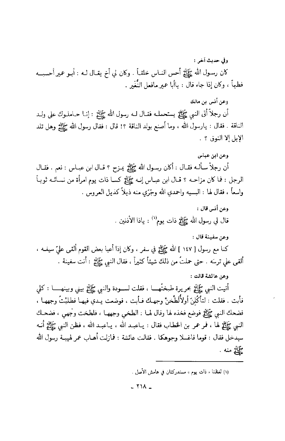 وفي حديث آخر: كان رسول الله صَلَّى اللهُ عَلَيْهِ وَسَلَّمَ أحسن الناس خلقاً. وكان لي أخ يقال له: أبو عمير أحسبه فطيما فطماً، وكان إذا جاء قال: يا أبا عمير ما فعل النغير. وعن أنس بن مالك: أن رجلاً أتى النبي صَلَّى اللهُ عَلَيْهِ وَسَلَّمَ فقال له رسول الله صَلَّى اللهُ عَلَيْهِ وَسَلَّمَ: إنا حاملوك على ولد الناقة. فقال: يا رسول الله، وما أصنع بولد الناقة؟! قال: فقال رسول الله صَلَّى اللهُ عَلَيْهِ وَسَلَّمَ وهل تلد الإبل إلا النوق؟. وعن ابن عباس: أن رجلاً سأله فقال: أكان رسول الله صَلَّى اللهُ عَلَيْهِ وَسَلَّمَ يمزح؟ قال ابن عباس: نعم. فقال الرجل: فما كان مزاحه؟ قال ابن عباس إنه صَلَّى اللهُ عَلَيْهِ وَسَلَّمَ كسا ذات يوم امرأة من نسائه ثوباً واسعاً، فقال لها: البسيه واحمدي الله وجري منه ذيلاً كذيل العروس. وعن أنس قال: قال لي رسول الله صَلَّى اللهُ عَلَيْهِ وَسَلَّمَ ذات يوم: يا ذا الأذنين. وعن سفينة قال: كنا مع رسول الله صَلَّى اللهُ عَلَيْهِ وَسَلَّمَ في سفر، وكان إذا أعيا بعض القوم ألقى عليّ سيفه، ألقى علي ترسه. حتى حملت من ذلك شيئاً كثيراً، فقال النبي صَلَّى اللهُ عَلَيْهِ وَسَلَّمَ: أنت سفينة.