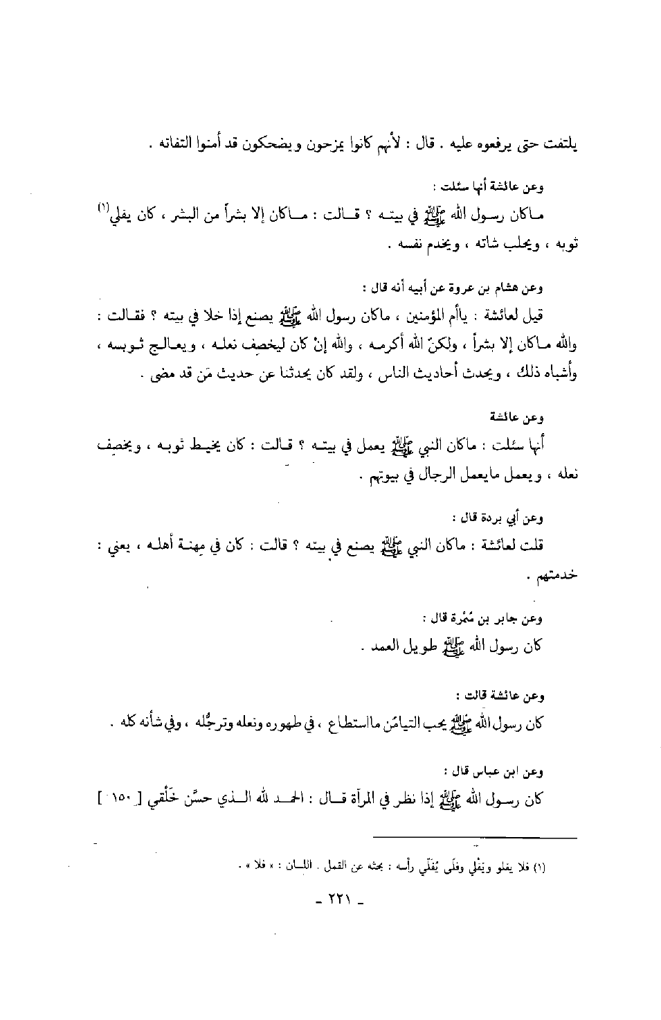 يلتفت حتى يرفعوه عليه. قال: لأنهم كانوا يمزحون ويضحكون قد أمنوا التفاته. وعن عائشة أنها سئلت: ما كان رسول الله صَلَّى اللهُ عَلَيْهِ وَسَلَّمَ في بيته؟ قالت: ما كان إلا بشراً من البشر، كان يفلي ثوبه، ويحلب شاته، ويخدم نفسه. وعن هشام بن عروة عن أبيه أنه قال: قيل لعائشة: يا أم المؤمنين، ما كان رسول الله صَلَّى اللهُ عَلَيْهِ وَسَلَّمَ يصنع إذا خلا في بيته؟ فقالت: والله ما كان إلا بشراً، ولكن الله أكرمه، والله إن كان ليخصف نعله، ويعالج ثوبه، وأشباه ذلك، ويحدث أحاديث الناس، ولقد كان يحدثنا عن حديث من قد مضى. وعن عائشة: أنها سئلت: ما كان النبي صَلَّى اللهُ عَلَيْهِ وَسَلَّمَ يعمل في بيته؟ قالت: كان يخيط ثوبه، ويخصف نعله، ويعمل ما يعمل الرجال في بيوتهم. وعن أبي بردة قال: قلت لعائشة: ما كان النبي صَلَّى اللهُ عَلَيْهِ وَسَلَّمَ يصنع في بيته؟ قالت: كان في مهنة أهله، يعني: خدمتهم. وعن جابر بن سمرة قال: كان رسول الله صَلَّى اللهُ عَلَيْهِ وَسَلَّمَ طويل العمد. وعن عائشة قالت: كان رسول الله صَلَّى اللهُ عَلَيْهِ وَسَلَّمَ يحب التيامن ما استطاع، في طهوره ونعله وترجله، وفي شأنه كله. وعن ابن عباس قال: كان رسول الله صَلَّى اللهُ عَلَيْهِ وَسَلَّمَ إذا نظر في المرآة قال: " الحمد لله الذي حسَّن خَلقي