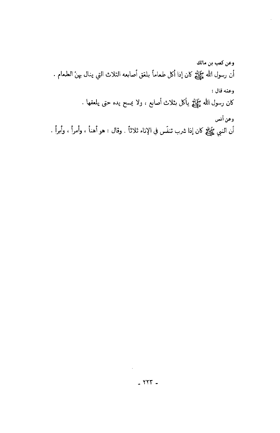 وعن كعب بن مالك: أن رسول الله صَلَّى اللهُ عَلَيْهِ وَسَلَّمَ كان إذا أكل طعاماً يلعق أصابعه الثلاث التي ينال بهن الطعام. وعنه قال: كان رسول الله صَلَّى اللهُ عَلَيْهِ وَسَلَّمَ يأكل بثلاث أصابع، ولا يمسح يده حتى يلعقها. وعن أنس: أن النبي صَلَّى اللهُ عَلَيْهِ وَسَلَّمَ كان إذا شرب تنفس في الإناء ثلاثاً. وقال: هو أهنأ، وأمرأ، وأبرأ.