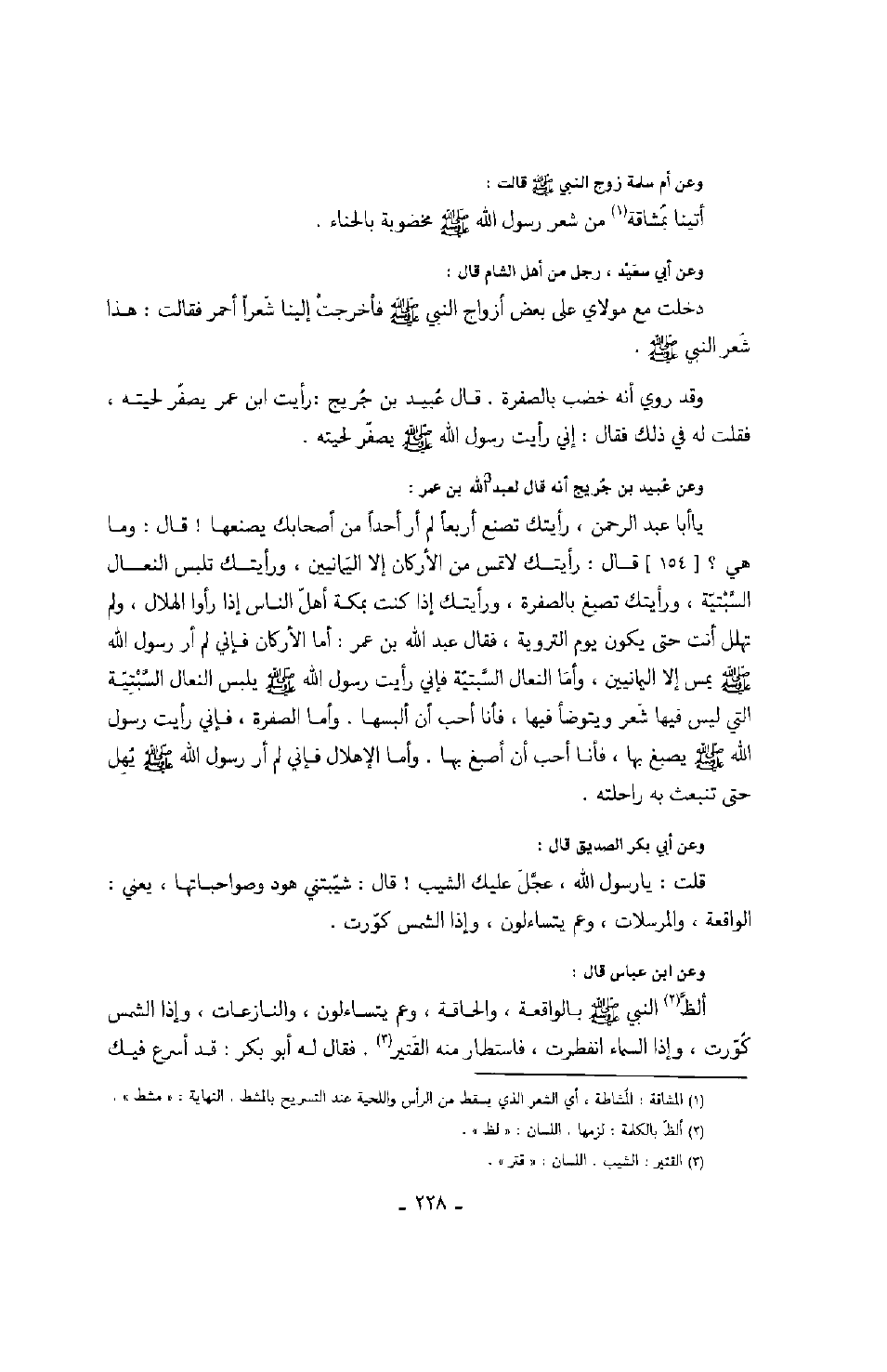 وعن أم سلمة زوج النبي صَلَّى اللهُ عَلَيْهِ وَسَلَّمَ قالت: أتينا بمشاقة من شعر رسول الله صَلَّى اللهُ عَلَيْهِ وَسَلَّمَ مخضوبة بالحناء. وعن أبي سعيد، رجل من أهل الشام قال: دخلت مع مولاي على بعض أزواج النبي صَلَّى اللهُ عَلَيْهِ وَسَلَّمَ فأخرجت إلينا شعراً أحمر فقالت: هذا شعر النبي صَلَّى اللهُ عَلَيْهِ وَسَلَّمَ. وقد روي أنه خضب بالصفرة. قال: عبيد بن جريج: رأيت ابن عمر يصفر لحيته، فقلت له في ذلك فقال: إني رأيت رسول الله صَلَّى اللهُ عَلَيْهِ وَسَلَّمَ يصفر لحيته. وعن عبيد بن جريج أنه قال لعبد الله بن عمر: يا أبا عبد الرحمن، رأيتك تصنع أربعاً لم أر أحداً من أصحابك يصنعها! قال: وما هي؟ قال: رأيتك لا تمس من الأركان إلا اليمانيين، ورأيتك تلبس النعال السبتية، ورأيتك تصبغ بالصفرة، ورأيتك إذا كنت بمكة أهل الناس إذا رأوا الهلال، ولم تهلل أنت حتى يكون يوم التروية، فقال عبد الله بن عمر: أما الأركان فإني لم أر رسول الله صَلَّى اللهُ عَلَيْهِ وَسَلَّمَ يمس إلا اليمانيين، وأما النعال السبتية فإني رأيت رسول الله صَلَّى اللهُ عَلَيْهِ وَسَلَّمَ يلبس النعال السبتية التي ليس فيها شعر ويتوضأ فيها، فأنا أحب أن ألبسها. وأما الصفرة، فإني رأيت رسول الله صَلَّى اللهُ عَلَيْهِ وَسَلَّمَ يصبغ بها، فأنا أحب أن أصبغ بها.