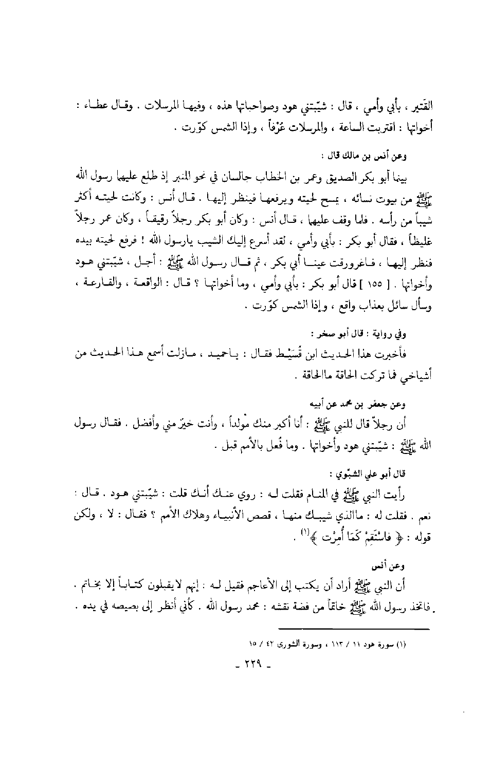 وعن جعفر بن محمد عن أبيه: أن رجلاً قال للنبي صَلَّى اللهُ عَلَيْهِ وَسَلَّمَ: أنا أكبر منك مولداً، وأنت خيرٌ مني وأفضل. فقال رسول الله صَلَّى اللهُ عَلَيْهِ وَسَلَّمَ: شيبتني هود وأخواتها. وما فُعل بالأمم قبل. قال أبو علي الشبَّوي: رأيت النبي صَلَّى اللهُ عَلَيْهِ وَسَلَّمَ في المنام فقلت له: روي عنك أنك قلت: شيبتني هود. قال: نعم. فقلت: ما الذي شيبك منها، قصص الأنبياء وهلاك الأمم؟ فقال: لا، ولكن قوله: " فاستقم كما أمرت ". وعن أنس: أن النبي صَلَّى اللهُ عَلَيْهِ وَسَلَّمَ أراد أن يكتب إلى الأعاجم فقيل له: إنهم لا يقبلون كتاباً إلا بخاتم. فاتخذ رسول الله صَلَّى اللهُ عَلَيْهِ وَسَلَّمَ خاتماً من فضة نقشه: محمد رسول الله. كأني أنظر إلى بصيصه في يده. وفي رواية عنه أيضاً: