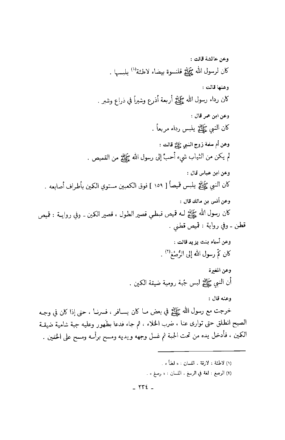 وعن ابن عمر قال: كان النبي صَلَّى اللهُ عَلَيْهِ وَسَلَّمَ يلبس رداء مربعاً. وعن أم سلمة زوج النبي صَلَّى اللهُ عَلَيْهِ وَسَلَّمَ قالت: لك يكن من الثياب شيء أحب إلى رسول الله صَلَّى اللهُ عَلَيْهِ وَسَلَّمَ من القميص. وعن ابن عباس قال: كان النبي صَلَّى اللهُ عَلَيْهِ وَسَلَّمَ يلبس قميصاً فوق الكعبين مستوي الكمين بأطراف أصابعه. وعن أنس بن مالك قال: كان رسول الله صَلَّى اللهُ عَلَيْهِ وَسَلَّمَ له قميص قبطي قصير الطول، وقصير الكمين وفي رواية: قميص قطن وفي رواية: قميص قطني. وعن أسماء بنت يزيد قالت: كان كم رسول الله صَلَّى اللهُ عَلَيْهِ وَسَلَّمَ إلى الرصغ. وعن المغيرة: أن النبي صَلَّى اللهُ عَلَيْهِ وَسَلَّمَ لبس جبة رومية ضيقة الكمين. وعنه قال: خرجت مع رسول الله صَلَّى اللهُ عَلَيْهِ وَسَلَّمَ في بعض ما كان يسافر، فسرنا، حتى إذا كان في وجه الصبح انطلق حتى توارى عنا، ضرب الخلاء، ثم جاء فدعا بطهور وعليه جبة شامية ضيقة الكمين، فأدخل يده من تحت الجبة ثم غسل وجهه ويديه ومسح برأسه ومسح على الخفين.