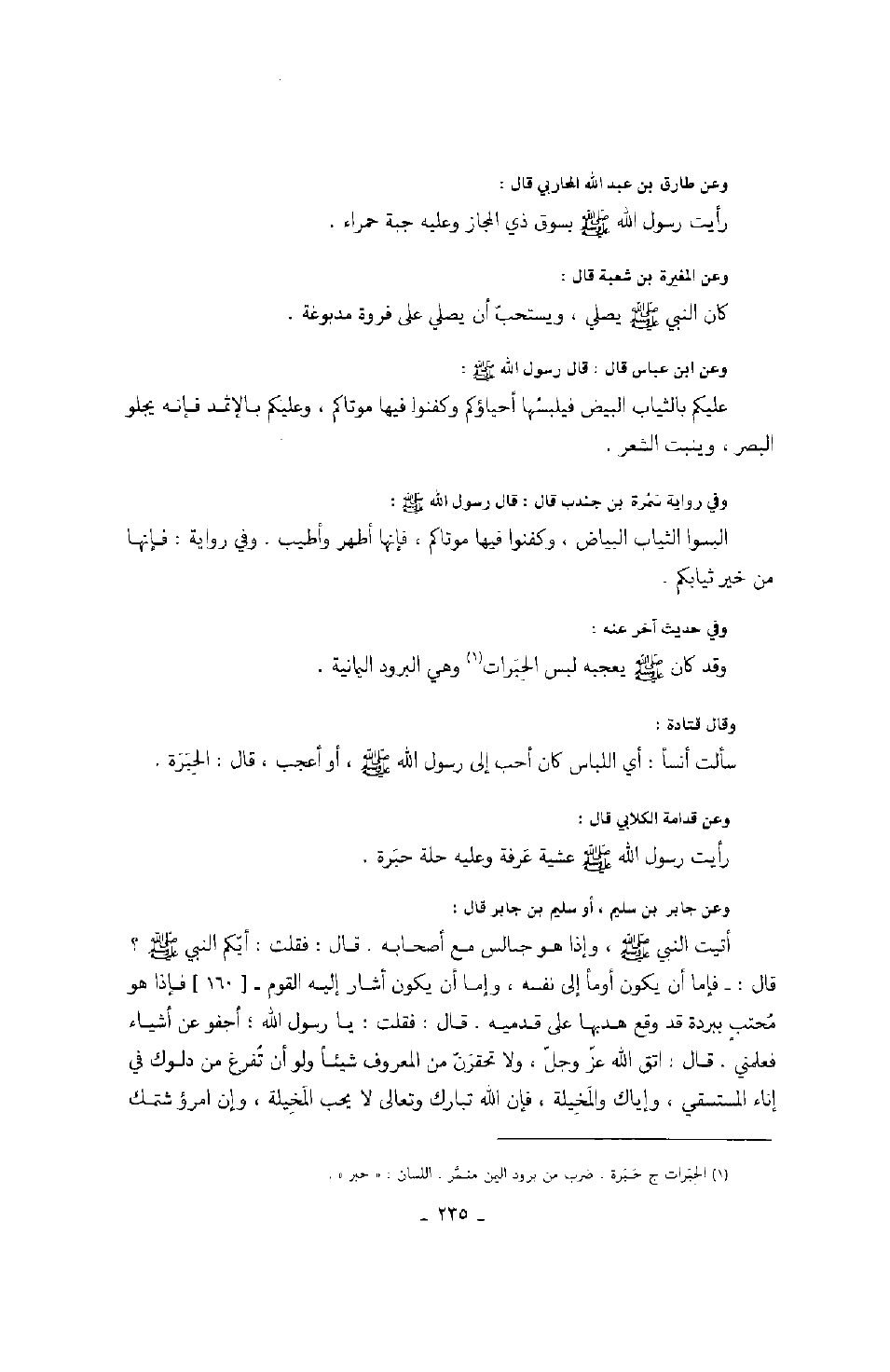 وعن طارق بن عبد الله المحاربي قال: رأيت رسول الله صَلَّى اللهُ عَلَيْهِ وَسَلَّمَ بسوق ذي المجاز وعليه جبة حمراء. وعن المغيرة بن شعبة قال: كان النبي صَلَّى اللهُ عَلَيْهِ وَسَلَّمَ يصلي، ويستحب أن يصلي على فروة مدبوغة. وعن ابن عباس قال: قال رسول الله صَلَّى اللهُ عَلَيْهِ وَسَلَّمَ: " عليكم بالثياب البيض فيلبسها أحياؤكم وكفنوا فيها أمواتكم، وعليكم بالإثمد فإنه يجلو البصر، وينبت الشعر ". وفي رواية سمرة بن جندب قال: قال رسول الله صَلَّى اللهُ عَلَيْهِ وَسَلَّمَ: " البسوا الثياب البياض، وكفنوا فيها موتاكم، فإنها أطهر وأطيب. وفي رواية: فإنها من خير ثيابكم ". وفي حديث آخر عنه: وقد كان صَلَّى اللهُ عَلَيْهِ وَسَلَّمَ يعجبه لبس الحبرات وهي البرود اليمانية. وقال قتادة: سألت أنساً: أي اللباس كان أحب إلى رسول الله صَلَّى اللهُ عَلَيْهِ وَسَلَّمَ، أو أعجب، قال: الحبرة. وعن قدامة الكلابي قال: رأيت رسول الله صَلَّى اللهُ عَلَيْهِ وَسَلَّمَ عشية عرفة وعليه حلة حبرة.