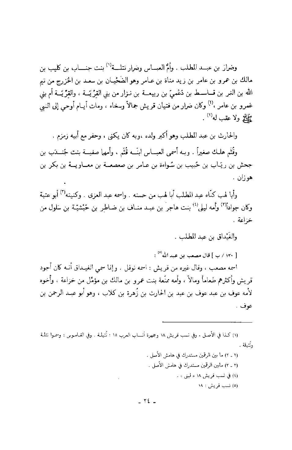 وضرار بن عبد المطلب. وأم العباس وضرار نتلة بنت جناب بن كليب بن مالك بن عمرو بن عامر بن زيد مناة بن عامر وهو الضحيان بن سعد بن الخزرج من تيم الله بن النمر بن قاسط بن دعمي بن ربيعة بن نزار من بني القرية، والقرية أم بني عمرو بن عامر، وكان ضرار من فتيان قريش جمالاً وسخاء.، ومات أيام أوحى إلى النبي صَلَّى اللهُ عَلَيْهِ وَسَلَّمَ ولا عقب له. والحارث بن عبد المطلب وهو أكبر ولده، وبه كان يكنى، وحفر مع أبيه زمزم. وقثم هلك صغيراً. وبه أسمى العباس ابنه قثم، وأمهما صفية بنت جندب بن جحش بن رياب بن حبيب بن سواءة بن عامر بن صعصعة بن معاوية بن بكر بن هوزان.