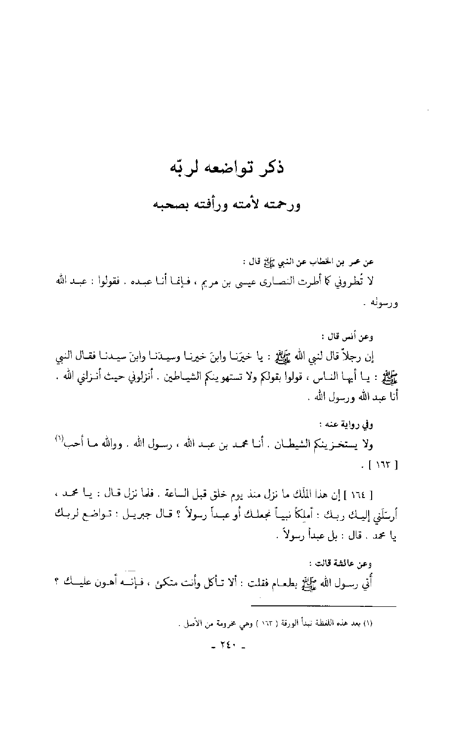 عن عمر بن الخطاب عن النبي صَلَّى اللهُ عَلَيْهِ وَسَلَّمَ قال: " لا تُطروني كما أطرت النصارى عيسى بن مريم، فإنما أنا عبده. فقولوا: عبد الله ورسوله ". وعن أنس قال: إن رجلاً قال لنبي الله صَلَّى اللهُ عَلَيْهِ وَسَلَّمَ: يا خيرنا وابن خيرنا وسيدنا وابن سيدنا فقال النبي صَلَّى اللهُ عَلَيْهِ وَسَلَّمَ: " يا أيها الناس، قولوا بقولكم ولا تستهوينكم الشياطين، أنزلوني حيث أنزلني الله. أنا عبد الله ورسول الله ". وفي رواية عنه: ولا يستخزينكم الشيطان. أنا محمد بن عبد الله، رسول الله. ووالله ما أحب. إن هذا الملك ما نزل منذ يوم خلق قبل الساعة. فلما نزل قال: يا محمد، أرسلني إليك ربك: أملكاً نبياً نجعلك أو عبداً رسولاً؟ قال جبريل: تواضع لربك يا محمد. قال: بل عبداً رسولاً. وعن عائشة قالت: أُتي رسول الله صَلَّى اللهُ عَلَيْهِ وَسَلَّمَ بطعام فقلت: ألا تأكل وأنت متكىء، فإنه أهون عليك؟