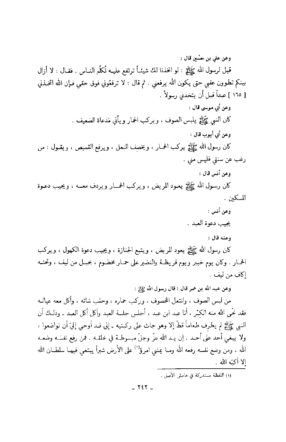 وعن علي بن حسين قال: قيل لرسول الله صَلَّى اللهُ عَلَيْهِ وَسَلَّمَ: لو اتخذنا لك شيئاً ترتفع عليه تُكلم الناس. فقال: " لا أزال بينكم تطوون عقبى حتى يكون الله يرفعني. ثم قال: لا ترفعوني فوق حقي فإن الله اتخذني عبداً قبل أن يتخذني رسولاً ". وعن أبي موسى قال: كان النبي صَلَّى اللهُ عَلَيْهِ وَسَلَّمَ يلبس الصوف، ويركب الحمار ويأتي مدعاة الضعيف. وعن أبي أيوب قال: كان رسول الله صَلَّى اللهُ عَلَيْهِ وَسَلَّمَ يركب الحمار، ويخصف النعل، ويرقع القميص، ويقول: " من رغب عن سنتي فليس مني ". وعن أنس قال: كان رسول الله صَلَّى اللهُ عَلَيْهِ وَسَلَّمَ يعود المريض، ويركب الحمار ويردف معه، ويجيب دعوة المسكين. وعن أنس: يجيب دعوة العبد. وعنه قال: كان رسول الله صَلَّى اللهُ عَلَيْهِ وَسَلَّمَ يعود المريض، ويتبع الجنازة، ويجيب دعوة الكهول، ويركب الحمار. وكان يوم خيبر ويوم قريظة والنضير على حمار مخطوم، بجبل من ليف، وتحته إكاف من ليف. وعن عبد الله بن عمر قال: قال رسول الله صَلَّى اللهُ عَلَيْهِ وَسَلَّمَ: " من لبس الصوف، وانتعل المخصوف، وركب حماره، وحلب شاته، وأكل معه عياله فقد نحى الله منه الكبر، أنا عبد ابن عبد، أجلس جلسة العبد وآكل أكل العبد وذلك أن النبي صَلَّى اللهُ عَلَيْهِ وَسَلَّمَ لم يطرف طعاماً قط إلا وهو جاث على ركبتيه إني قد أوحي إلي أن تواضعوا، ولا يبغي أحد على أحد. إن يد الله عز وجل مبسوطة في خلقه. فمن رفع نفسه وضعه الله، ومن وضع نفسه رفعه الله وما يمشي امرؤ على الأرض شبراً يبتغي فيها سلطان الله إلا أكبه الله ".