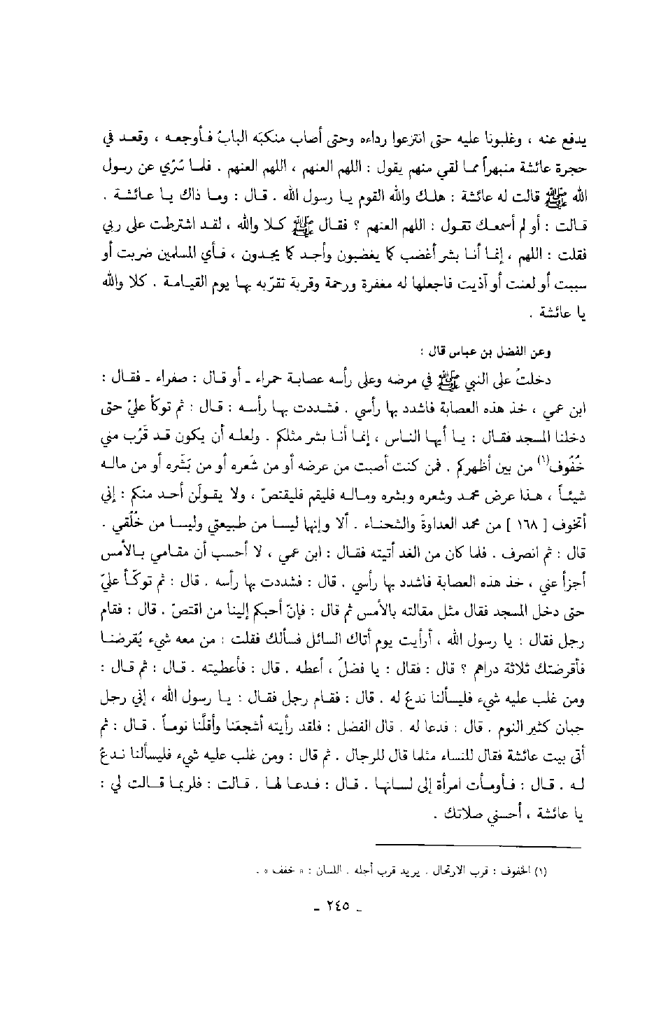 يدفع عنه، وغلبونا عليه حتى انتزعوا رداءه وحتى أصاب منكبه الباب فأوجعه، وقعد في حجرة عائشة منبهراً مما لقي منهم يقول: اللهم العنهم، اللهم العنهم. فلما سري عن رسول الله صَلَّى اللهُ عَلَيْهِ وَسَلَّمَ قالت له عائشة: هلك والله القوم يا رسول الله. قال: وما ذاك يا عائشة. قالت: أولم أسمعك تقول: اللهم العنهم؟ فقال صَلَّى اللهُ عَلَيْهِ وَسَلَّمَ كلا والله، لقد اشترطت على ربي فقلت: " اللهم، إنما أنا بشر أغضب كما يغضبون وأجد كما يجدون، فأي المسلمين ضربت أو سببت أو لعنت أو آذيت فاجعلها له مغفرة ورحمة وقربة تقربه بها يوم القيامة. كلا والله يا عائشة ". وعن الفضل بن عباس قال: دخلت على النبي صَلَّى اللهُ عَلَيْهِ وَسَلَّمَ في مرضه وعلى رأسه عصابة حمراء أو قال: صفراء فقال: ابن عمي، خذ هذه العصابة فاشدد بها رأسي. فشددت بها رأسه. قال: ثم توكأ علي حتى دخلنا المسجد فقال: " يا أيها الناس، إنما أنا بشر مثلكم. ولعله أن يكون قد قرُب مني خفوف من بين أظهركم. فمن كنت أصبت من عرضه أو من شعره أو من بشره أو من ماله شيئاً، هذا عرض محمد وشعره وبشره وماله فليقم فليقتص، ولا يقولن أحد منكم: إني أتخوف من محمد العداوة والشحناء. ألا وإنهما ليسا من طبيعتي وليسا من خلقي ". قال: ثم انصرف. فلما كان من الغد أتيته فقال: " ابن عمي، لا أحسب أن مقامي بالأمس أجزأ عني، خذ هذه العصابة فاشدد بها رأسي ". قال: فشددت بها رأسه. قال: ثم توكأ علي حتى دخلنا المسجد فقال مثل مقالته بالأمس ثم قال: " فإن أحبكم إلينا من اقتص ". قال: فقام رجل فقال: يا رسول الله، أرأيت يوم أتاك السائل فسألك فقلت: من معه شيء يقرضنا فأقرضتك ثلاث دراهم؟ قال: فقال: " يا فضل أعطه ". قال: فأعطيته. قال: ثم قال: " ومن غلب عليه شيء فليسألنا ندع له ". قال: فقام رجل فقال: يا رسول الله، إني رجل جبان كثير النوم. قال: فدعا له. قال الفضل: فلقد رأيته أشجعنا وأقلنا نوماً. قال: ثم أتى بيت عائشة فقال للنساء مثلما قال للرجال. ثم قال: " ومن غلب عليه شيء فليسألنا ندع له. قال: فأومأت امرأة إلى لسانها. قال: فدعا لها. قالت: فلربما قالت لي: يا عائشة، أحسني صلاتك.