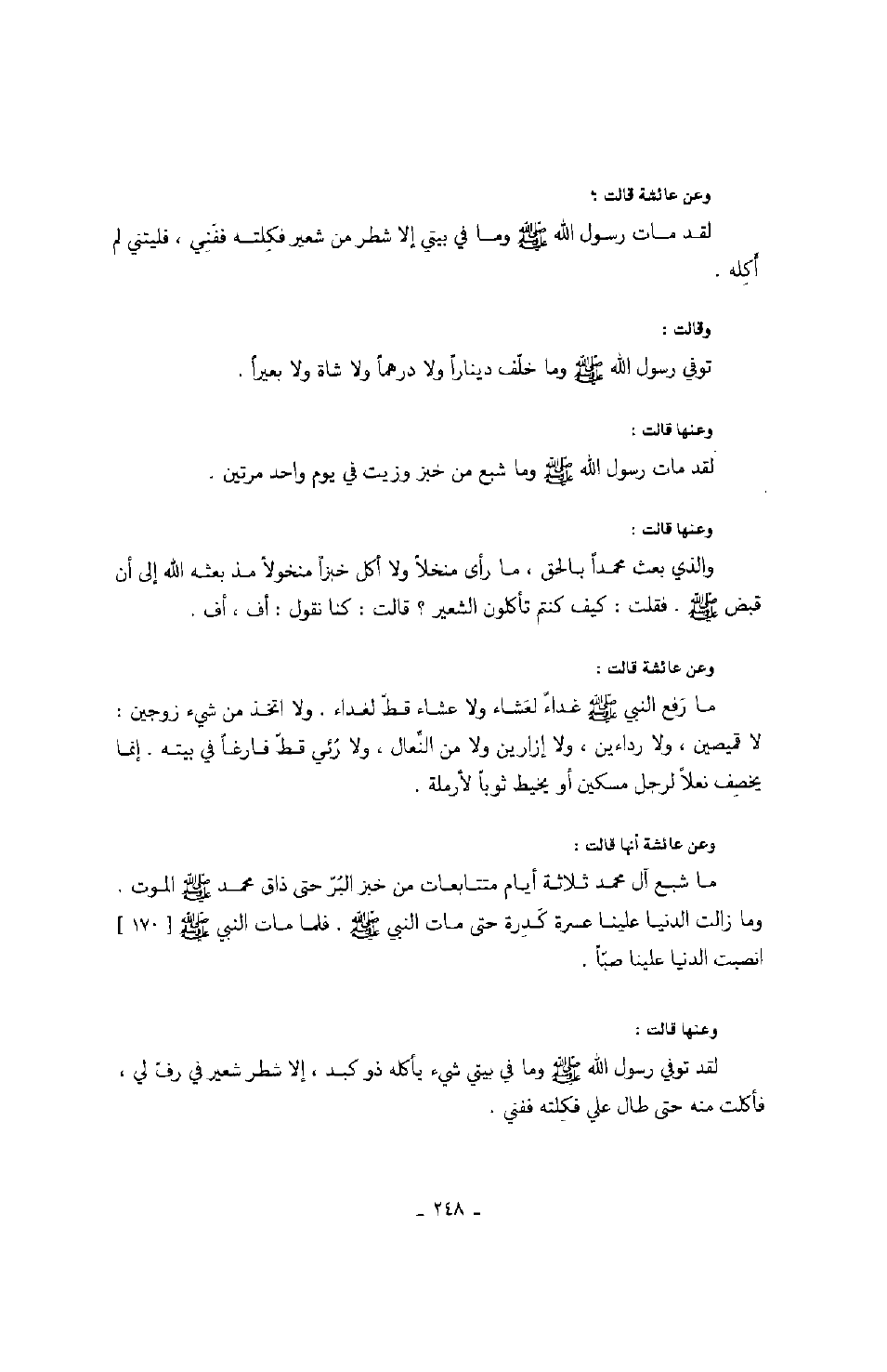 وعن عائشة قالت: لقد مات رسول الله صَلَّى اللهُ عَلَيْهِ وَسَلَّمَ وما في بيتي إلا شطر من شعير فكلته ففني، فليتني لم اكله. وقالت: توفي رسول الله صَلَّى اللهُ عَلَيْهِ وَسَلَّمَ وما خلف ديناراً ولا درهماً ولا شاة ولا بعيراً. وعنها قالت: لقد مات رسول الله صَلَّى اللهُ عَلَيْهِ وَسَلَّمَ وما شبع من خبز وزيت في يوم واحد مرتين. وعنها قالت: والذي بعث محمداً صَلَّى اللهُ عَلَيْهِ وَسَلَّمَ بالحق، ما أرى منخلاً ولا أكل خبزاً منخولاً مذ بعثه الله إلى أن قبض صَلَّى اللهُ عَلَيْهِ وَسَلَّمَ. فقلت: كيف كنتم تأكلون الشعير؟ قالت: كنا نقول: أف، أف. وعن عائشة قالت: ما رفع النبي صَلَّى اللهُ عَلَيْهِ وَسَلَّمَ غداءً لعشاء ولا عشاء قط لغداء. ولا اتخذ من شيء زوجين: لا قميص، ولا رداءين ولا من النعال، ولا رُئي قط فارغاً في بيته.