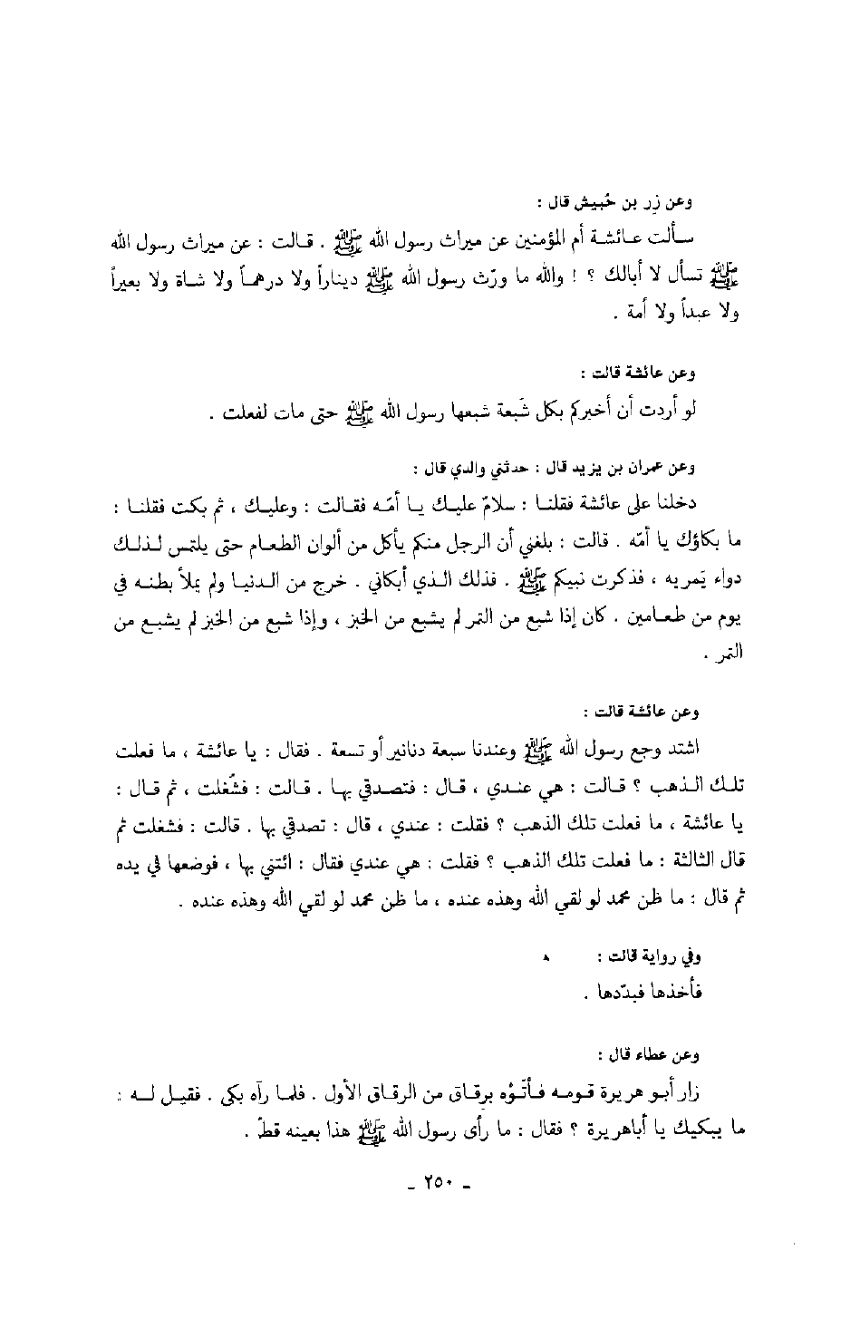 وعن زر بن حبيش قال: سألت عائشة أم المؤمنين عن ميراث رسول الله صَلَّى اللهُ عَلَيْهِ وَسَلَّمَ. قالت: عن ميراث رسول الله صَلَّى اللهُ عَلَيْهِ وَسَلَّمَ تسأل لا أبالك؟! والله ما ورّث رسول الله صَلَّى اللهُ عَلَيْهِ وَسَلَّمَ ديناراً ولا درهماً ولا شاة ولا بعيراً ولا عبداً ولا أمة. وعن عائشة قالت: لو أردت أن أخبركم بكل شعبة شعبها رسول الله صَلَّى اللهُ عَلَيْهِ وَسَلَّمَ حتى مات لفعلت. وعن عمران بن يزيد قال: حدثني والدي قال: دخلنا على عائشة فقلنا: سلامٌ عليك يا أمّه فقالت: وعليك، ثم بكت فقلنا: ما بكاؤك يا أمّه؟ قالت: بلغني أن الرجل منكم يأكل من ألوان الطعام حتى يلتمس لذلك دواء يمريه، فذكرت نبيكم صَلَّى اللهُ عَلَيْهِ وَسَلَّمَ. فذلك الذي أبكاني. خرج من الدنيا ولم يملأ بطنه في يوم من طعامين. كان إذا شبع من التمر لم يشبع من الخبز، وإذا شبع من الخبز لم يشبع من التمر. وعن عائشة قالت: اشتد وجع رسول الله صَلَّى اللهُ عَلَيْهِ وَسَلَّمَ وعندنا سبعة دنانير أو تسعة. فقال: يا عائشة، ما فعلت تلك الذهب؟ قالت: هي عندي، قال: فتصدقي بها. قالت: فشغلت، ثم قال: يا عائشة، ما فعلت تلك الذهب؟ فقلت: عندي. قال: تصدقي بها. قالت: فشغلت ثم قال الثالثة: ما فعلت تلك الذهب؟ فقلت: هي عندي فقال: ائتني بها، فوضعها في يده ثم قال: " ما ظن محمد لو لقي الله وهذه عنده، ما ظن محمد لو لقي الله وهذه عنده ". وفي رواية قالت: فأخذها فبددها. وعن عطاء قال: زار أبو هريرة قومه فأتوه برقاق من الرقاق الأول. فلما رآه بكى. فقيل له: ما يبكيك يا أبا هريرة؟ فقال " ما رأى رسول الله صَلَّى اللهُ عَلَيْهِ وَسَلَّمَ هذا بعينه قط.