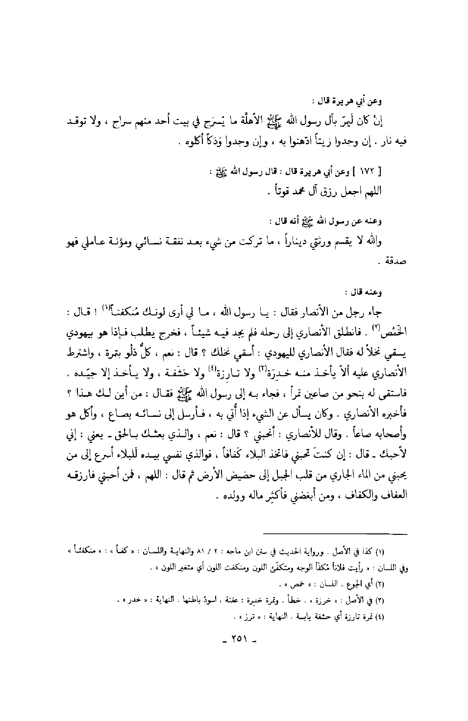 إن وجدواً زيتاً ادهنوا به، وإن وجدوا ودكاً أكلوه. وعن أبي هريرة قال: قال رسول الله صَلَّى اللهُ عَلَيْهِ وَسَلَّمَ: " اللهم اجعل رزق آل محمد قوتاً ". وعنه عن رسول الله صَلَّى اللهُ عَلَيْهِ وَسَلَّمَ أنه قال: " والله لا يقسم ورثتي ديناراً، ما تركت من شيء بعد نفقة نسائي ومؤنة عاملي فهو صدقة ". وعنه قال: جاء رجل من الأنصار فقال: يا رسول الله، ما لي أرى لونك منكفتاً! قال الخمص، فانطلق الأنصاري إلى رحله فلم يجد فيه شيئاً، فخرج يطلب فإذا هو بيهودي يسقي نخلاً له فقال الأنصاري لليهودي: أسقي نخلك؟ قال: نعم، كل دلو بتمرة، واشترط الأنصاري عليه ألا يأخذ منه خدرة ولا تارزة ولا حشفة، ولا يأخذ إلا جيدة. فاستسقى له بنحو من صاعين تمراً، فجاء به رسول الله صَلَّى اللهُ عَلَيْهِ وَسَلَّمَ فقال: من أين لك هذا؟ فأخبره الأنصاري. وكان يسأل عن الشيء إذا أُتي به، فأرسل إلى نسائه بصاع، وأكل هو وأصحابه صاعاً. وقال للأنصاري: أتحبني؟ قال: نعم، والذي بعثك بالحق يعني: إني لأحبك قال: إن كنت فاتخذ البلاء كفافاً، فوالذي نفسي بيده للبلاء أسرع إلى من يحبني من الماء الجاري من قلب الجبل إلى حضيض الأرض ثم قال: " اللهم، فمن أحبني فارزقه العفاف والكفاف، ومن أبغضني فأكثر ماله وولده ".