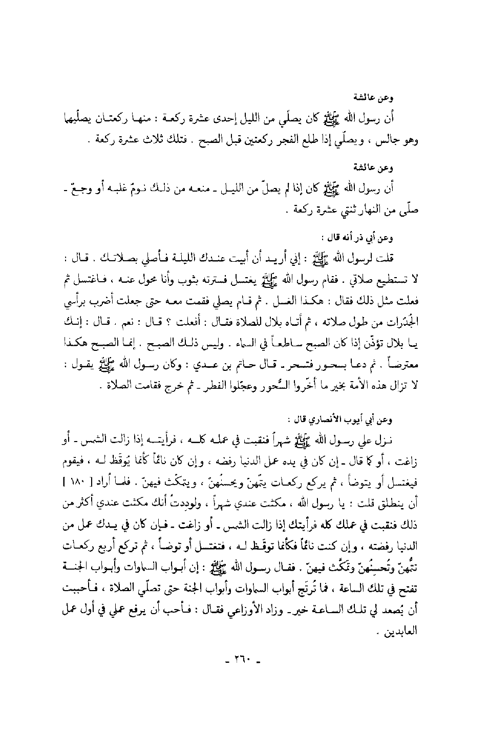 وعن عائشة: أن رسول الله صَلَّى اللهُ عَلَيْهِ وَسَلَّمَ كان يصلي من الليل إحدى عشرة ركعة: منها ركعتان يصليهما وهو جالس، ويصلي إذا طلع الفجر ركعتين قبل الصبح. فتلك ثلاث عشرة ركعة. وعن عائشة: أن رسول الله صَلَّى اللهُ عَلَيْهِ وَسَلَّمَ كان إذا لم يصلّ من الليل منعه من ذلك نومٌ غلبه أو وجعٌ صلى من النهار ثنتي عشرة ركعة. وعن أبي ذر أنه قال: قلت لرسول الله صَلَّى اللهُ عَلَيْهِ وَسَلَّمَ: إني أريد أن أبيت عندك الليلة فأصلي بصلاتك. قال: لا تستطيع صلاتي. فقام رسول الله صَلَّى اللهُ عَلَيْهِ وَسَلَّمَ يغتسل فسترته بثوب وأنا محول عنه، فاغتسل ثم فعلت مثل ذلك فقال: هكذا الغسل. ثم قام يصلي فقمت معه حتى جعلت أضرب برأسي الجدرات من طول صلاته، ثم أتاه بلال للصلاة فقال: أفعلت؟ قال: نعم. قال: إنك يا بلال تؤذن إذا كان الصبح ساطعاً في السماء. وليس ذلك الصبح. إنما الصبح هكذا معترضاً. ثم دعا بسحور فتسحر قال حاتم بن عدي: وكان رسول الله صَلَّى اللهُ عَلَيْهِ وَسَلَّمَ يقول: " لا تزال هذه الأمة بخير ما أخروا السحور وعجلوا الفطر " ثم خرج فقامت الصلاة. وعن أبي أيوب الأنصاري قال: نزل علي رسول الله صَلَّى اللهُ عَلَيْهِ وَسَلَّمَ شهراً فنقبت في عمله كله، فرأيته إذا زالت الشمس أو زاغت، أو كما قال إن كان في يده عمل الدنيا رفضه، وغن كان نائماً كأنما يوقظ له، فيقوم فيغتسل أو يتوضأ، ثم يركع ركعات يتمهن ويحسنهن، ويتمكث فيهن. فلما أراد أن ينطلق قلت: يا رسول الله، مكثت عندي شهراً، ولوددت أنك مكثت عندي أكثر من ذلك فنقبت في عملك كله فرأيتك إذا زالت الشمس - أو زاغت فإن كان في يدك عمل من الدنيا رفضته، وإن كنت نائماً فكأنما توقظ له، فتغتسل أو توضأ، ثم تركع أربع ركعات تتمهن وتحسنهن وتمكث فيهن. فقال رسول الله صَلَّى اللهُ عَلَيْهِ وَسَلَّمَ: إن أبواب السماوات وأبواب الجنة تفتح في تلك الساعة، فما ترتج أبواب السماوات وأبواب الجنة حتى تصلي الصلاة، فأحببت أن يصعد لي تلك الساعة خير وزاد الأوزاعي فقال: فأحب أن يرفع عملي في أول عمل العابدين.