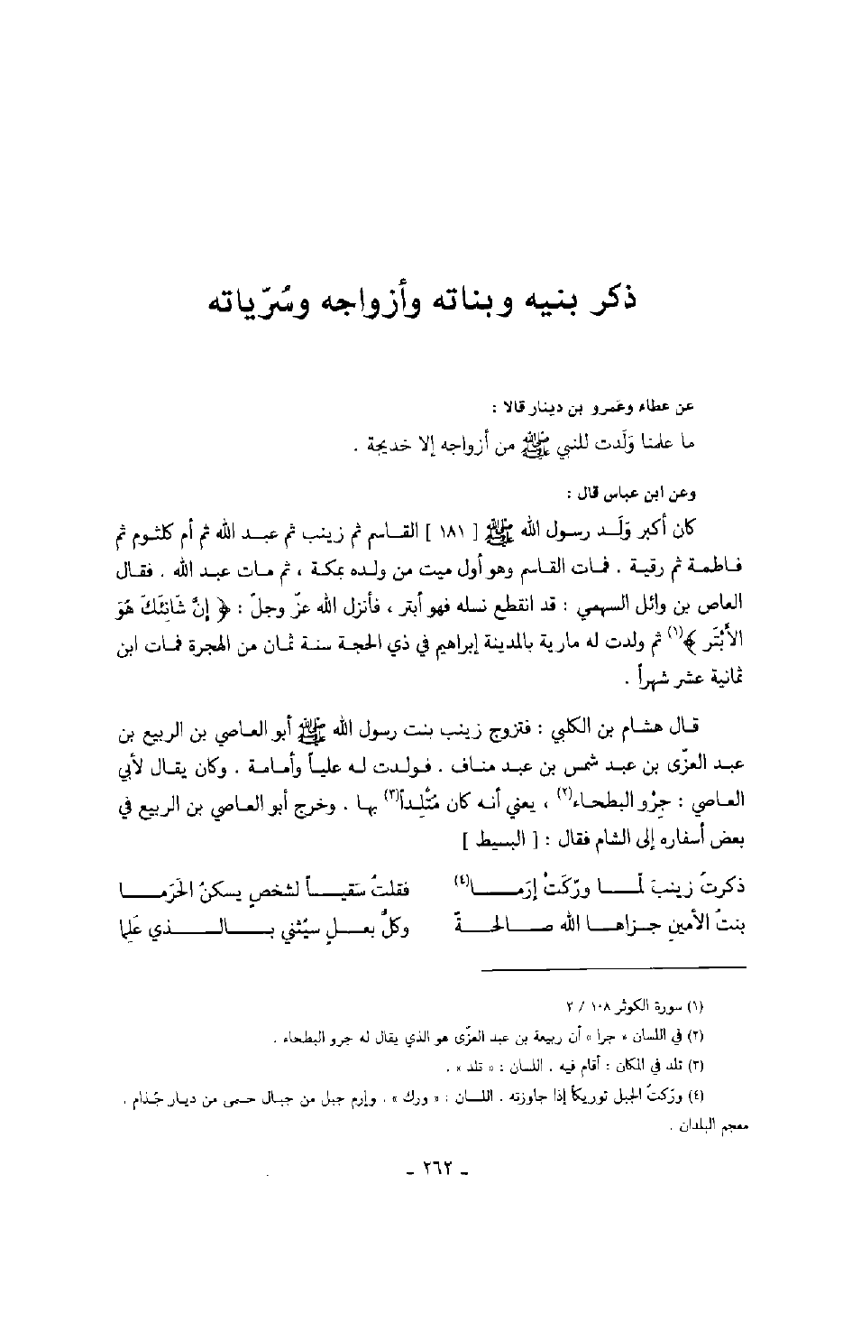 عن عطاء وعمرو بن دينار قالا: ما علمنا ولدت للنبي صَلَّى اللهُ عَلَيْهِ وَسَلَّمَ من أزواجه إلا خديجة. وعن ابن عباس قال: كان أكبر ولد رسول الله صَلَّى اللهُ عَلَيْهِ وَسَلَّمَ القاسم ثم زينب ثم عبد الله ثم أم كلثوم ثم فاطمة ثم رقية. فمات القاسم وهو أول ميت من ولده بمكة، ثم مات عبد الله. فقال العاص بن وائل السهمي: قد انقطع نسله فهو أبتر، فأنزل الله عز وجل " إن شانئك هو الأبتر " ثم ولدت له مارية بالمدينة إبراهيم في ذي الحجة سنة ثمان من الهجرة فمات ابن ثمانية عشر شهراً. قال هشام بن الكلبي: فتزوج زينب بنت رسول الله صَلَّى اللهُ عَلَيْهِ وَسَلَّمَ أبو العاصي بن الربيع بن عبد العزى بن عبد شمس بن عبد مناف. فولدت له علياً وأمامة. وكان يقال لأبي العاص: جرو البطحاء، يعني أنه كان متلداً بها. وخرج أبو العاصي بن الربيع في بعض أسفاره إلى الشام فقال: البسيط