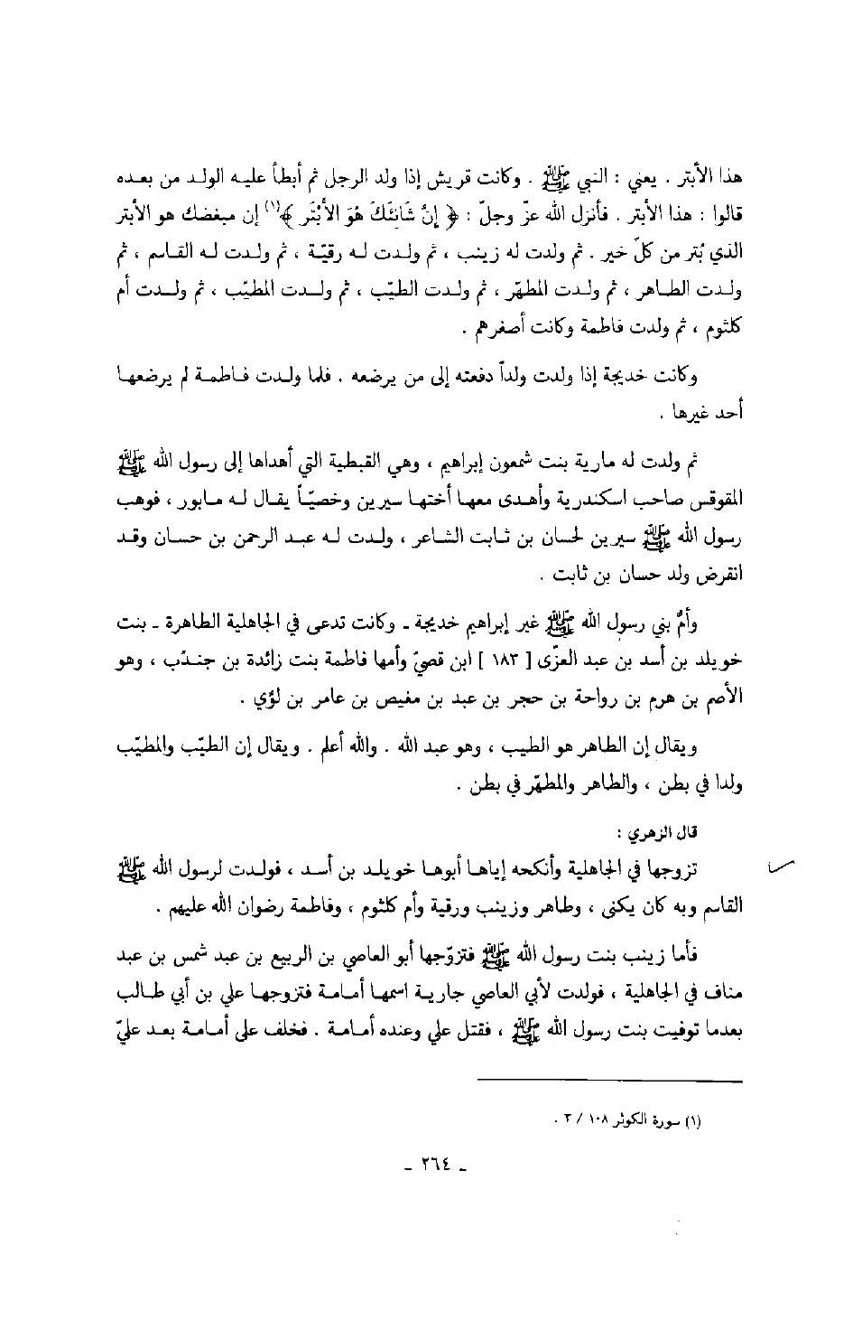 وكانت قريش إذا ولد الرجل ثم أبطأ عليه الولد من بعده قالوا: هذا الأبتر. فأنزل الله عز وجل: " إن شانئك هو الأبتر " إن مبغضك هو الأبتر الذي بتر من كل خير. ثم ولدت له زينب، ثم ولدت له رقية، ثم ولدت له القاسم، ثم ولدت الطاهر، ثم ولدت المطهر، ثم ولدت الطيب، ثم ولدت المطيب، ثم ولدت أم كلثوم، ثم ولدت فاطمة وكانت أصغرهم. وكانت خديجة إذا ولدت ولداً دفعته إلى من يرضعه. فلما ولدت فاطمة لم يرضعها أحد غيرها. ثم ولدت مارية بنت شمعون إبراهيم، وهي القبطية التي أهداها إلى رسول الله صَلَّى اللهُ عَلَيْهِ وَسَلَّمَ المقوقس صاحب اسكندرية وأهدى معها أختها سيرين وخصياً يقال له مابور، فوهب رسول الله صَلَّى اللهُ عَلَيْهِ وَسَلَّمَ سيرين لحسان بن ثابت الشاعر، ولدت له عبد الرحمن بن حسان وقد انقرض ولد حسان بن ثابت. وأم بني رسول الله صَلَّى اللهُ عَلَيْهِ وَسَلَّمَ غير إبراهيم خديجة وكانت تدعى في الجاهلية الطاهرة بنت خويلد بن أسد بن العزى ابن قصي وأمها فاطمة بنت زائدة بن جندب، وهو الأصم بن هرم بن رواحة بن حجر بن عبد بن مغيص بن عامر بن لؤي. ويقال إن الطاهر هو الطيب، وهو عبد الله، والله أعلم.