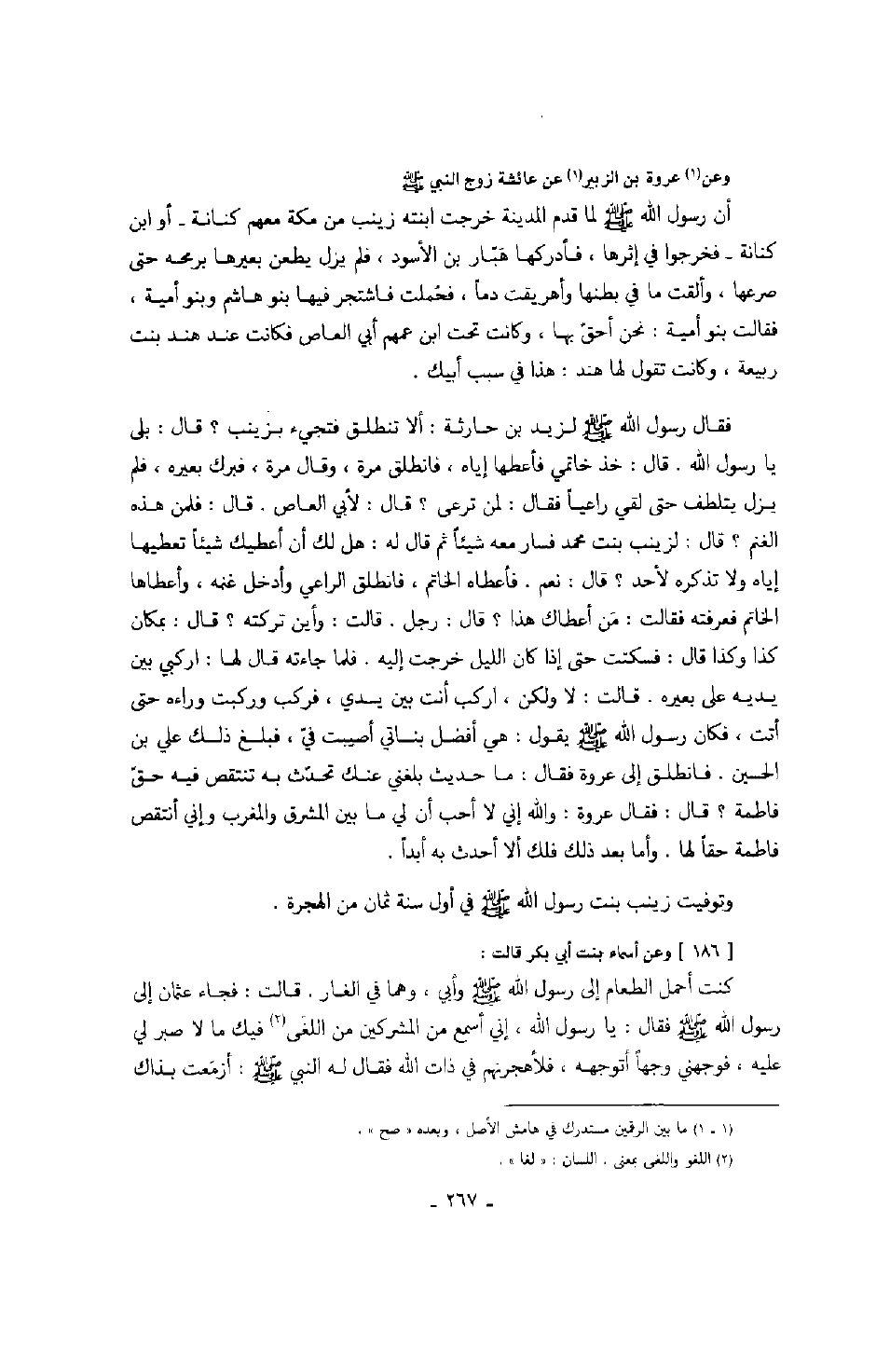وعن عروة بن الزبير عن عائشة زوج النبي صَلَّى اللهُ عَلَيْهِ وَسَلَّمَ: أن رسول الله صَلَّى اللهُ عَلَيْهِ وَسَلَّمَ لما قدم المدينة خرجت ابنته زينب من مكة معهم كنانة أو ابن كنانة فخرجوا في أثرها، فأدركها هبار بن الأسود، فلم يزل يطعن بعيرها برمحه حتى صرعها، وألقت ما في بطنها وأهريقت دماً، فحُملت فاشتجر فيها بنو هاشم وبنو أمية، فقال بنو أمية: نحن أحق بها، وكانت تحت ابن عمهم أبي العاص فكانت عند هند بنت ربيعة، وكانت تقول لها هند: هذا في سبب أبيك. فقال رسول الله صَلَّى اللهُ عَلَيْهِ وَسَلَّمَ لزيد بن حارثة: ألا تنطلق فتجيء بزينب؟ قال: بلى يا رسول الله. قال: خذ خاتمي فأعطها إياه، فانطلق مرة، وقال مرة، فبرك بعيره، فلم يزل يتلطف حتى لقي راعياً فقال: لمن ترعى؟ قال: لأبي العاص. قال: فلمن هذه الغنم؟ قال: لزينب بنت محمد صَلَّى اللهُ عَلَيْهِ وَسَلَّمَ فسار معه شيئاً ثم قال له: هل لك أن أعطيك شيئاً تعطيها إياه ولا تذكره لأحد؟ قال: نعم. فأعطاه الخاتم، فانطلق الراعي وأدخل غنمه، وأعطاها الخاتم فعرفته فقالت: من أعطاك هذا؟ قال: رجل. قالت: وأين تركته؟ قال: بمكان كذا وكذا قال: فسكتت حتى إذا كان الليل خرجت إليه. فلما جاءته قال لها: اركبي بين يديه بعيره. قالت: لا ولكن، اركب أنت بين يدي، فركب وركبت وراءه حتى أتت، فكان رسول الله صَلَّى اللهُ عَلَيْهِ وَسَلَّمَ يقول: هي أفضل بناتي أصيبت فيّ، فبلغ ذلك علي بن الحسين. فانطلق إلى عروة فقال: ما حديث بلغني عنك تحدث به تنتقص فيه حق فاطمة؟ قال: فقال عروة: والله إني لا أحب أن لي ما بين المشرق والمغرب إني أنتقص فاطمة حقاً لها. وأما بعد ذلك فلك ألا أحدث به أبداً. وتوفيت زينب بنت رسول الله صَلَّى اللهُ عَلَيْهِ وَسَلَّمَ في أول سنة ثمان من الهجرة. وعن أسماء بنت أبي بكر قالت: كنت أحمل الطعام إلى رسول الله صَلَّى اللهُ عَلَيْهِ وَسَلَّمَ وأبي، وهما في الغار. قالت: فجاء عثمان إلى رسول الله صَلَّى اللهُ عَلَيْهِ وَسَلَّمَ فقال: يا رسول الله، إني أسمع من المشركين من اللغى فيك ما لا صبر لي عليه، فوجهني وجهاً أتوجهه، فلأهجرنهم في ذات الله فقال له النبي صَلَّى اللهُ عَلَيْهِ وَسَلَّمَ: أزمعت بذاك