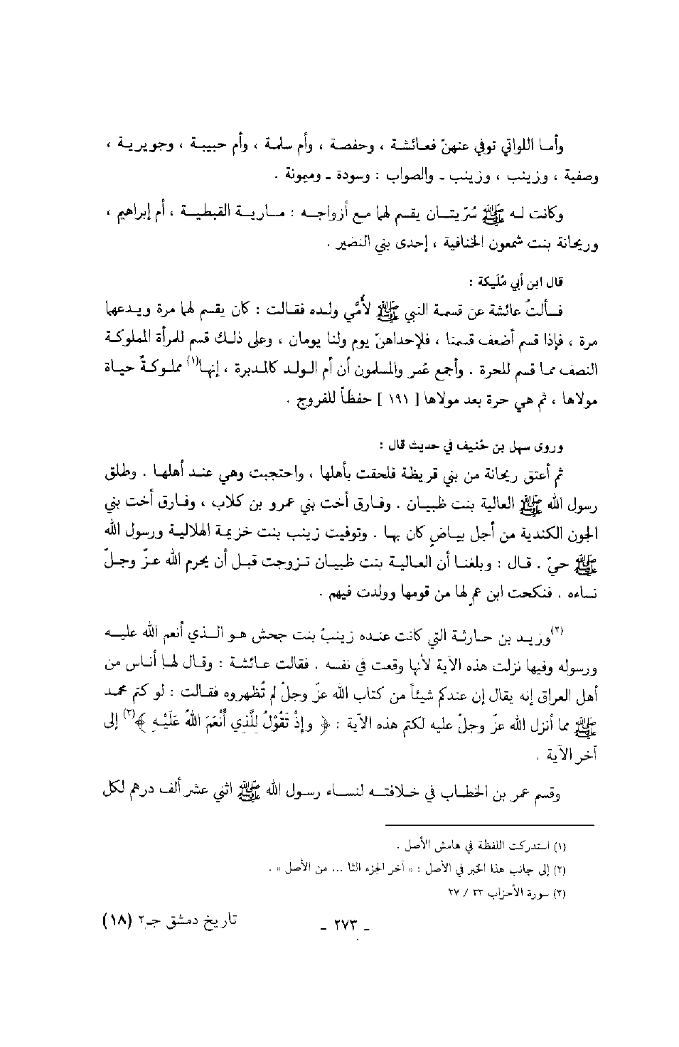 وأما اللواتي توفي عنهن فعائشة، وحفصة، وأم سليم، وأم حبيبة، وجويرية، وصفية، وزينب، وزينب والصواب: وسودة وميمونة. وكانت له صَلَّى اللهُ عَلَيْهِ وَسَلَّمَ سريتان يقسم لهما مع أزواجه: مارية القبطية، أم إبراهيم، وريحانة بنت شمعون الخنافية، إحدى بني النضير. قال ابن أبي مُليكة: فسألت عائشة عن قسمة النبي صَلَّى اللهُ عَلَيْهِ وَسَلَّمَ لأُمي ولده فقالت: كان يقسم لهما مرة ويدعهما مرة، فإذا قسم أضعف قسمنا، فلإحداهن يوم ولنا يومان، وعلى ذلك قسم للمرأة المملوكة النصف مما قسم للحرة، وأجمع عمر والمسلمون أن أم الولد كالمدبرة، إنها مملوكة حية مولاها، ثم هي حرة بعد مولاها حفظاً للفروج. وروى سهل بن حُنيف في حديث قال: ثم أعتق ريحانة من بني قريظة فلحقت بأهلها، واحتجبت وهي عند أهلها. وطلق رسول الله صَلَّى اللهُ عَلَيْهِ وَسَلَّمَ العالية بنت ظبيان، وفارق أخت عمرو بن كلاب، وفارق أخت بني الجون الكندية من أجل بياضٍ كان بها. وتوفيت زينب بنت خزيمة الهلالية ورسول الله صَلَّى اللهُ عَلَيْهِ وَسَلَّمَ حيّ. قال: وبلغنا أن العالية بنت ظبيان تزوجت قبل أن يحرم الله عز وجل نساءه. فنكحت ابن عمٍ لها من قومها وولدت فيهم. وزيد بن حارثة التي عنده زينب بنت جحش هو الذي أنعم الله عليه ورسوله صَلَّى اللهُ عَلَيْهِ وَسَلَّمَ وفيها نزلت الآية لأنها وقعت في نفسه. فقالت عائشة: وقال لها أناس من أهل العراق إنه يقال إنه عندكم شيئاً من كتاب الله عز وجل لم تُظهروه فقالت: لو كتم محمد صَلَّى اللهُ عَلَيْهِ وَسَلَّمَ مما أنزل الله عز وجل عليه لكتم هذه الآية: " وإذ تقول للذي أنعم الله عليه " إلى آخر الآية.