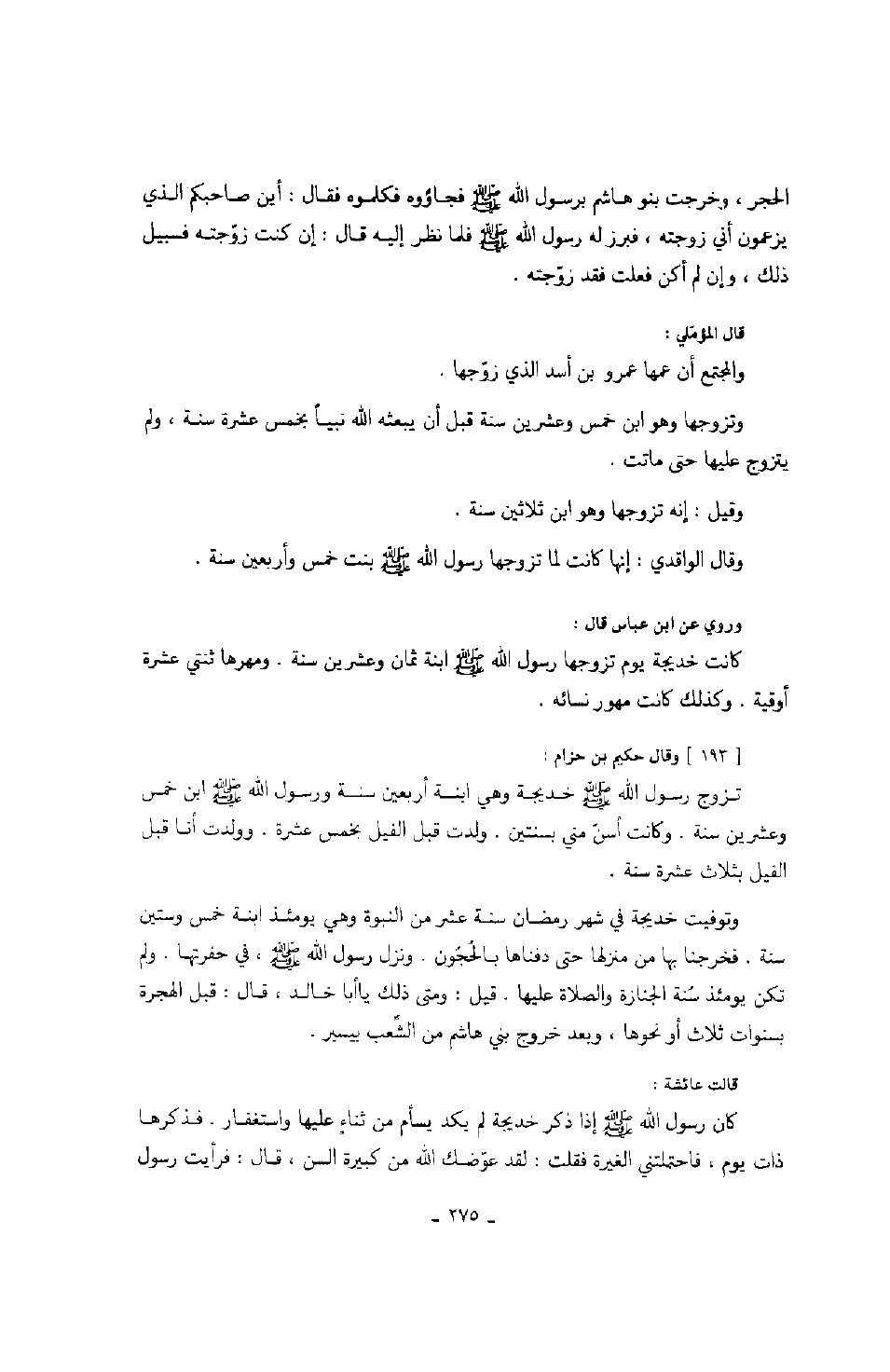 الحجر، وخرجت بنو هاشم برسول الله صَلَّى اللهُ عَلَيْهِ وَسَلَّمَ فجاؤوه فكلموه فقال: أين صاحبكم الذي يزعمون أني زوجته، فبرز له رسول الله صَلَّى اللهُ عَلَيْهِ وَسَلَّمَ فلما نظر إليه قال: إن كنت زوجته فسبيل ذلك، وإن لم أكن فعلت فقد زوجته. قال المؤملي: والمجتمع أن عمها عمرو بن أسد الذي زوجها. وتزوجها وهو ابن خمس وعشرين سنة قبل أن يبعثه الله عز وجل نبياً بخمس عشرة سنة، ولم يتزوج عليها حتى ماتت. وقيل: أنه تزوجها وهو ابن ثلاثين سنة. وقال الواقدي: إنها كانت لما تزوجها رسول الله صَلَّى اللهُ عَلَيْهِ وَسَلَّمَ بنت خمس وأربعين سنة.