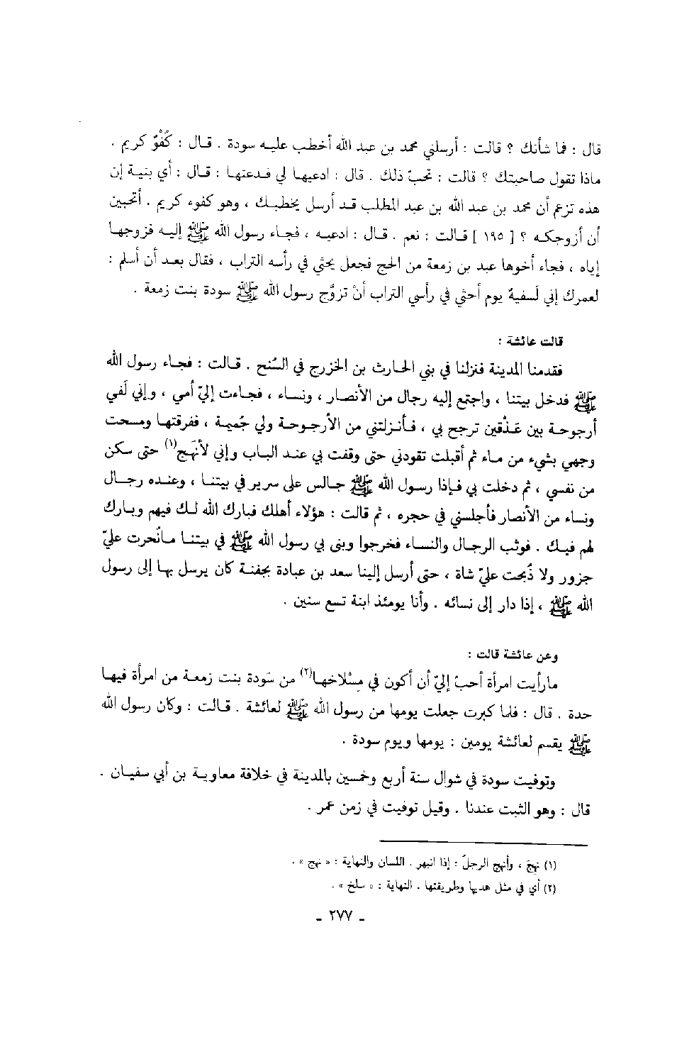 قال: فما شأنك؟ قالت: أرسلني محمد بن عبد الله أخطب عليه سودة. قال: كفوٌ كريم. ماذا تقول صاحبتك؟ قالت: تحب ذلك. قال: ادعيها لي فدعتها. قال: أي بنية إن هذه تزعم أن محمد بن عبد الله بن عبد المطلب قد أرسل يخطبك، وهو كفوء كريم. أتحبين أن أزوجكه؟ قالت: نعم. قال: ادعيه، فجاء رسول الله صَلَّى اللهُ عَلَيْهِ وَسَلَّمَ إليه فزوجها إياه، فجاء أخوها عبد بن زمعة من الحج فجعل يحثي في رأسه التراب، فقال بعد أن أسلم: لعمرك إني لسفيهٌ يوم أحثي في رأسي التراب أن تزوج رسول الله صَلَّى اللهُ عَلَيْهِ وَسَلَّمَ سودة بنت زمعه. قالت عائشة: فقدمنا المدينة فنزلنا في بني الحارث بن الخزرج في السنُح. قالت: فجاء رسول الله صَلَّى اللهُ عَلَيْهِ وَسَلَّمَ فدخل بيتنا، واجتمع إليه رجال من الأنصار، ونساء، فجاءت إليّ أمي، وإني لفي أرجوحة بين عذقين ترجح بي، فأنزلتني من الأرجوحة ولي جُميمة، ففرقتها ومسحت وجهي بشيء من ماء ثم أقبلت تقودني حتى وقفت بي عند الباب وإني لأنهج حتى سكن من نفسي، ثم دخلت بي فإذا رسول الله صَلَّى اللهُ عَلَيْهِ وَسَلَّمَ جالس على سرير في بيتنا، وعنده رجال ونساء من الأنصار فأجلسني في حجره، ثم قالت: هؤلاء أهلك بارك الله لك فيهم وبارك لهم فيك. فوثب الرجال والنساء فخرجوا وبنى بي رسول الله صَلَّى اللهُ عَلَيْهِ وَسَلَّمَ في بيتنا ما نُحرت عليّ جزور ولا ذُبحت علي شاة، حتى أرسل إلينا سعد بن عبادة بجفنة كان يرسل بها إلى رسول الله صَلَّى اللهُ عَلَيْهِ وَسَلَّمَ، إذا دار إلى نسائه. وأنا يومئذ ابنة تسع سنين. وعن عائشة قالت: ما رأيت امرأة أحب إلي أن أكون في مسلاخها من سودة بنت زمعة من امرأة فيها حدة. قال: فلما كبرت جعلت يومها من رسول الله صَلَّى اللهُ عَلَيْهِ وَسَلَّمَ لعائشة. قالت: وكان رسول الله صَلَّى اللهُ عَلَيْهِ وَسَلَّمَ يقسم لعائشة يومين: يومها ويوم سودة. وتوفيت سودة في شوال سنة أربع وخمسين بالمدينة في خلافة معاوية بن أبي سفيان. قال: وهو الثبت عندنا. وقيل: توفيت في زمن عمر.