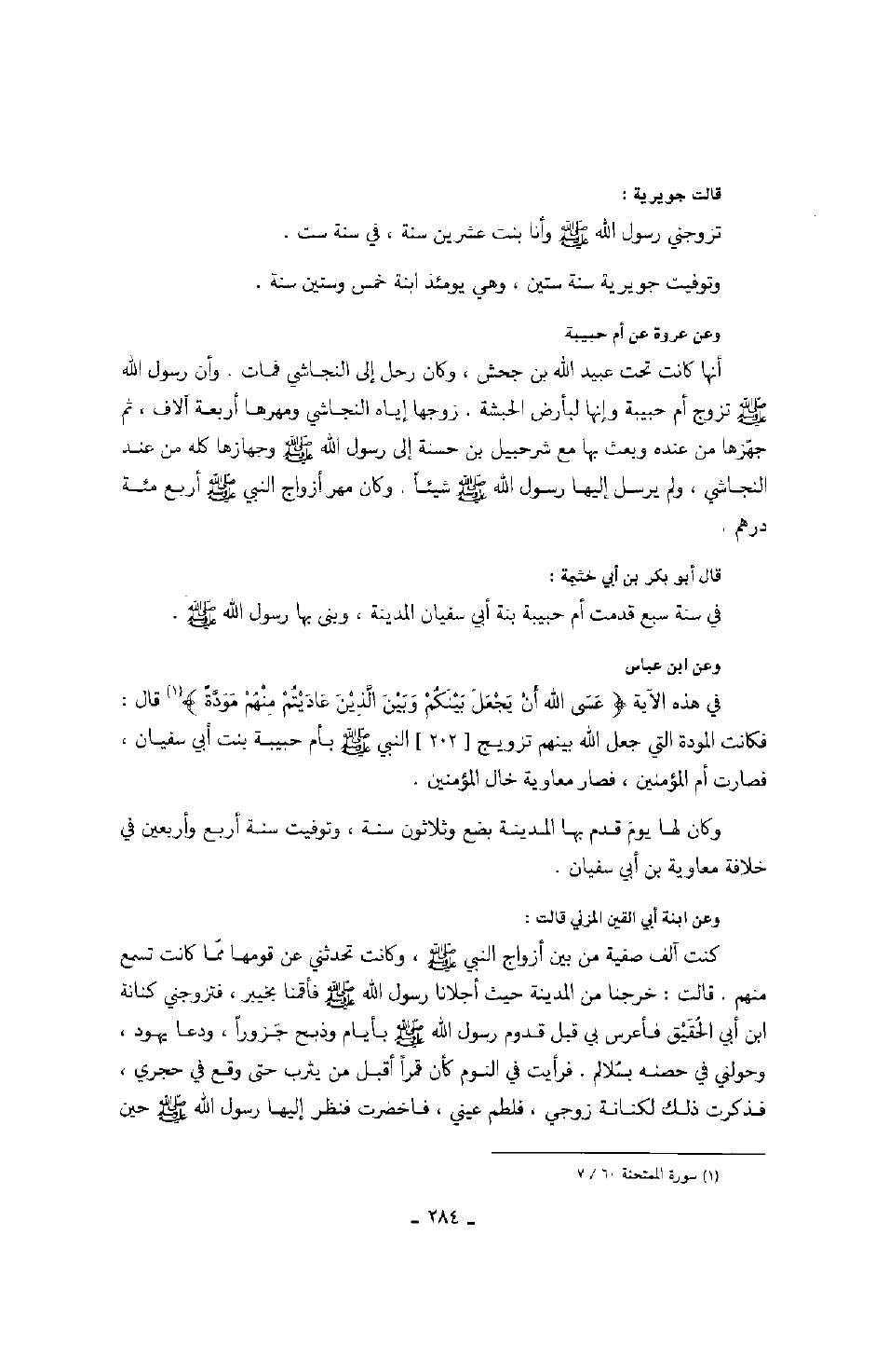قالت جويرية: تزوجني رسول الله صَلَّى اللهُ عَلَيْهِ وَسَلَّمَ وأنا بنت عشرين سنة في سنة ست. وتوفيت جويرية سنة ستين، وهي يومئذ ابنة خمس وستين سنة. وعن عروة عن أم حبيبة: أنها كانت تحت عبيد الله بن جحش. وكان رحل إلى النجاشي فمات وأن رسول الله صَلَّى اللهُ عَلَيْهِ وَسَلَّمَ تزوج أم حبيبة وإنها لبأرض الحبشة زوجها إياه الحبشي ومهرها أربعة آلاف، وجهزها من عنده وبعث بها مع شرحبيل إلى حسنة إلى رسول الله صَلَّى اللهُ عَلَيْهِ وَسَلَّمَ وجهازه كله من عند النجاشي، ولم يرسل إليه رسول الله صَلَّى اللهُ عَلَيْهِ وَسَلَّمَ شيئاً. وكان مهر أزواج النبي صَلَّى اللهُ عَلَيْهِ وَسَلَّمَ أربع مئة درهم. قال أبو بكر بن أبي خثيمة: في سنة سبع قدمت أم حبيبة ابنة أبي سفيان المدينة وبنى بها رسول الله صَلَّى اللهُ عَلَيْهِ وَسَلَّمَ. وعن ابن عباس في هذه الآية " عسى أن يجعل الله بينكم وبين الذين عاديتم منهم مودة " قال فكانت المودة التي جعل الله بينهم تزويج النبي صَلَّى اللهُ عَلَيْهِ وَسَلَّمَ 0 بأم حبيبة بنت أبي سفيان فصارت أم المؤمنين، فصار معاوية خال المؤمنين. وكان لها يوم قدمت المدينة بضع وثلاثون سنة وتوفيت سنة أربع وأربعين في خلافة معاوية بن أبي سفيان. وعن ابنة أبي القين المزني قالت: كنت آلف صفية من بين أزواج النبي صَلَّى اللهُ عَلَيْهِ وَسَلَّمَ، وكانت تحدثني عن قومها فكانت تسمع منهم. قالت: خرجنا من المدينة حيث أجلانا رسول الله صَلَّى اللهُ عَلَيْهِ وَسَلَّمَ فأقمنا بخيبر، فتزوجني كنانة بنت أبي الحقيق فأعرس بي قبل قدوم رسول الله صَلَّى اللهُ عَلَيْهِ وَسَلَّمَ بأيام وذبح جزوراً، ودعا اليهود وحولني في حضنه بسلالم. فرأيت في النوم كأن قمراً أقبل من يثرب حتى وقع في حجري، فذكرت ذلك لكنانة زوجي، فلطم عيني فاخضرت فنظر إليها رسول الله صَلَّى اللهُ عَلَيْهِ وَسَلَّمَ حين
