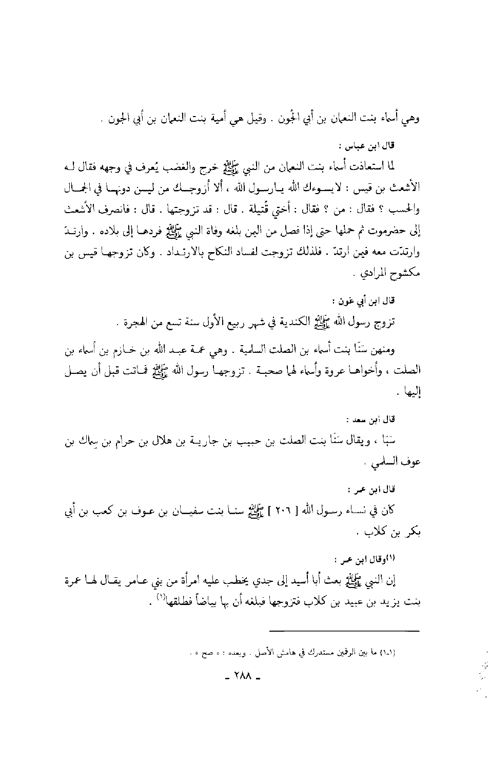 وقيل هي أمية بنت النعمان بن أبي الجون. قال ابن عباس: لما استعاذت أسماء بنت النعمان من النبي صَلَّى اللهُ عَلَيْهِ وَسَلَّمَ خرج والغضب يعرف في وجهه فقال له الأشعث بن قيس: لا يسوءك الله يا رسول الله، ألا أزوجك من ليس دونها في الجمال والحسب؟ فقال: من؟ فقال: أختي قتيلة. قال: قد تزوجتها. قال: فانصرف الأشعث إلى حضرموت ثم حملها حتى إذا فصل من اليمن بلغه وفاة النبي صَلَّى اللهُ عَلَيْهِ وَسَلَّمَ فردها إلى بلاده. وارتد وارتدت معه فيمن ارتد. فلذلك تزوجت لفساد النكاح بالإرتداد. وكان تزوجها قيس بن مكشوح المرادي. قال ابن أبي عون: تزوج رسول الله صَلَّى اللهُ عَلَيْهِ وَسَلَّمَ الكندية في شهر ربيع الأول سنة تسع من الهجرة. ومنهن سنا بنت أسماء بن الصلت السلمية. وهي عمة عبد الله بن خازم بن أسماء بن الصلت، وأخواها عروة وأسماء لهما صحبة. تزوجها رسول الله صَلَّى اللهُ عَلَيْهِ وَسَلَّمَ فماتت قبل أن يصل إليها. قال ابن سعد: سبا، ويقال سنا بنت الصلت بن حبيب بن جارية بن هلال بن حرام بن سماك بن عوف السلمي. قال ابن عمر: كان في نساء رسول الله صَلَّى اللهُ عَلَيْهِ وَسَلَّمَ0 سنا بنت سفيان بن عوف بن كعب بن أبي بكر بن كلاب. وقال ابن عمر: إن النبي صَلَّى اللهُ عَلَيْهِ وَسَلَّمَ بعث أبا أسيد إلى جدي يخطب عليه امرأة من بني عامر يقال لها عمرة بنت يزيد بن عبيد بن كلاب فتزوجها فبلغة أن بها بياضا فطلقها.