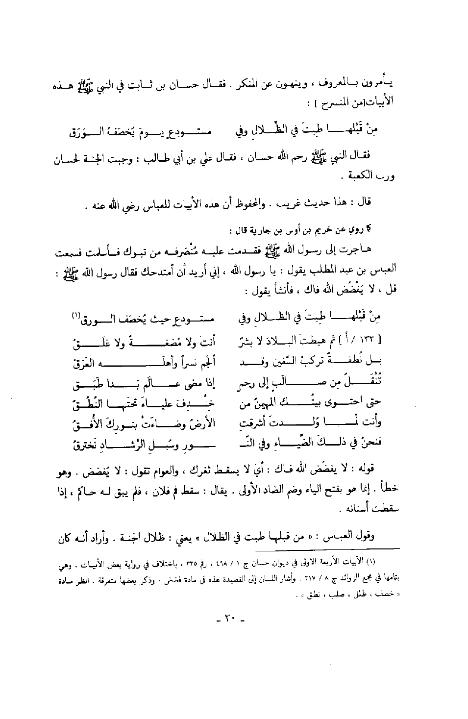 فقال النبي صَلَّى اللهُ عَلَيْهِ وَسَلَّمَ رحم الله حسان، فقال علي بن أبي طالب: وجبت الجنة لحسان ورب الكعبة.