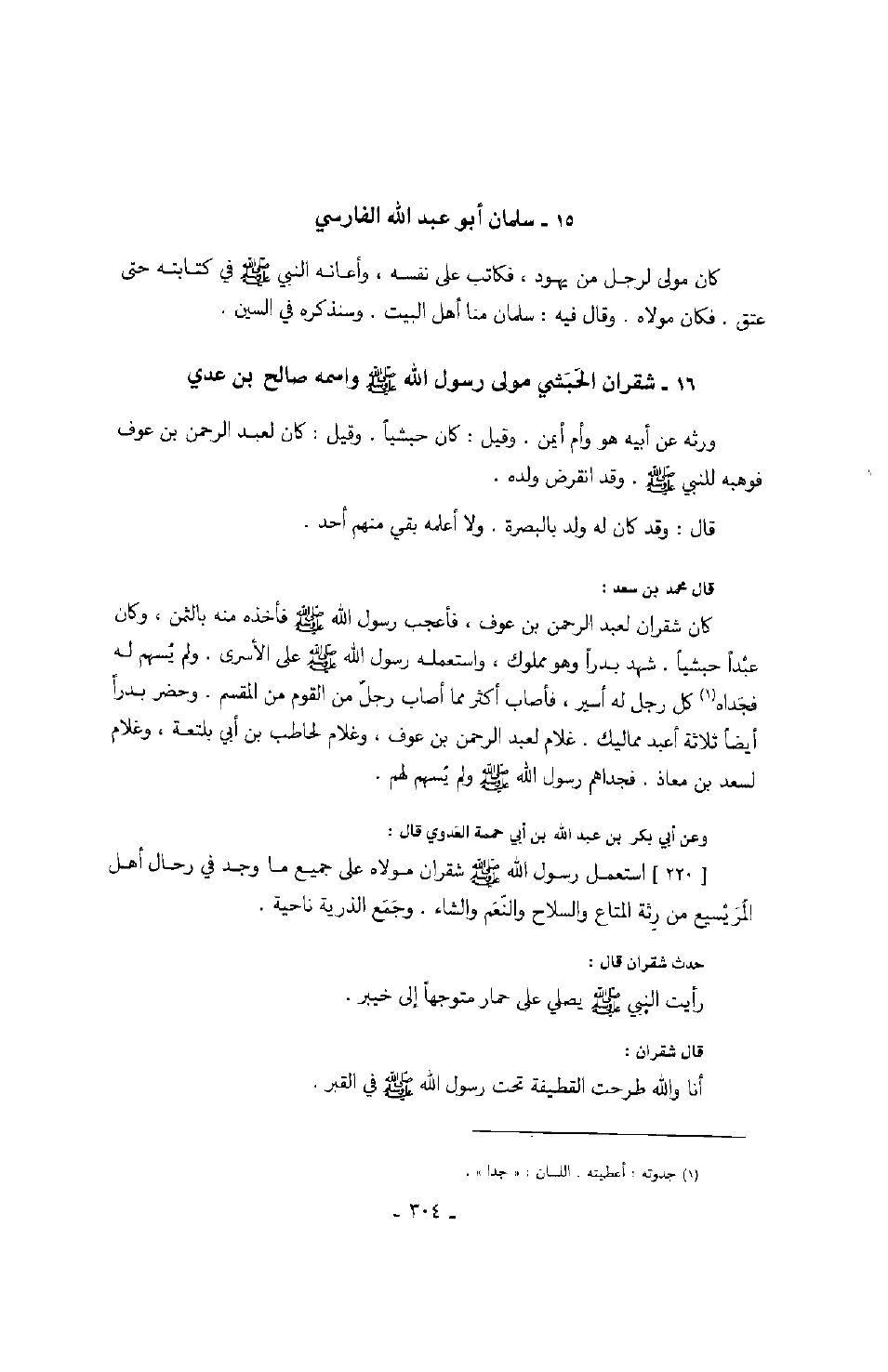 رسول الله صَلَّى اللهُ عَلَيْهِ وَسَلَّمَ سفينة. فقلت: ولما سماك سفينة؟ قال: خرج رسول الله صَلَّى اللهُ عَلَيْهِ وَسَلَّمَ ومعه أصحابه فثقل عليهم متاعهم، فقال لي ابسط كساءك، فبسطت فجعلوا فيه متاعهم ثم حملوه علي. فقال لي رسول الله صَلَّى اللهُ عَلَيْهِ وَسَلَّمَ: احمل فإنما أنت سفينة فلو حملت يومئذ قدر بعير أو بعيرين أو ثلاثة أو أربعة أو خمسة أو ستة أو سبعة ما ثقل علي إلا أن يخفوا. وفي رواية: كنا مع النبي صَلَّى اللهُ عَلَيْهِ وَسَلَّمَ في سفر، فكلما أعيا بعض قومي ألقى علي سيفه وترسه ورمحه حتى حملت شيئاً كثيراً، فقال النبي صَلَّى اللهُ عَلَيْهِ وَسَلَّمَ: أنت سفينة. قال سفينة: قالت أم سلمة: أعتقك على أن تخدم رسول الله صَلَّى اللهُ عَلَيْهِ وَسَلَّمَ ما عشت. قلت: ولو لم تشترطي علي لخدمت رسول الله صَلَّى اللهُ عَلَيْهِ وَسَلَّمَ، أو ما فارقت رسول الله صَلَّى اللهُ عَلَيْهِ وَسَلَّمَ. فأعتقتني أو شارطتني أن أخدم رسول الله صَلَّى اللهُ عَلَيْهِ وَسَلَّمَ ما عشت. وعن سفينة قال: خدمت رسول الله صَلَّى اللهُ عَلَيْهِ وَسَلَّمَ عشر سنين. وعنه قال: لقيني الأسد فقلت: أنا سفينة، مولى رسول الله صَلَّى اللهُ عَلَيْهِ وَسَلَّمَ قال: فضرب بذنبه الأرض وقعد. وعن سفينة مولى رسول الله صَلَّى اللهُ عَلَيْهِ وَسَلَّمَ قال: كنت في سفر فعرض لي الأسد فقلت: يا أبا الحارث، أنا سفينة، مولى رسول الله صَلَّى اللهُ عَلَيْهِ وَسَلَّمَ قال: فولى رافعاً ذنبه يهمهم. وكان النبي صَلَّى اللهُ عَلَيْهِ وَسَلَّمَ يتوضأ بالمد ويغتسل بالصاع من الجنابة. وعنه قال: ركبنا في سفينة تجاراً في البحر، فانكسرت السفينة، فرمى بنا البحر، فخرجت أمشي لا أدري أين أتوجه. فكان أول شئ رأيت الأسد. فقلت: أي يا أبا الحارث، أنا مولىً لرسول الله صَلَّى اللهُ عَلَيْهِ وَسَلَّمَ فهمهم فدفعني برأسه، فجعلت أندفع حتى أوقفني على الطريق، وفي رواية: ثم همهم، فظننت أن السلام.