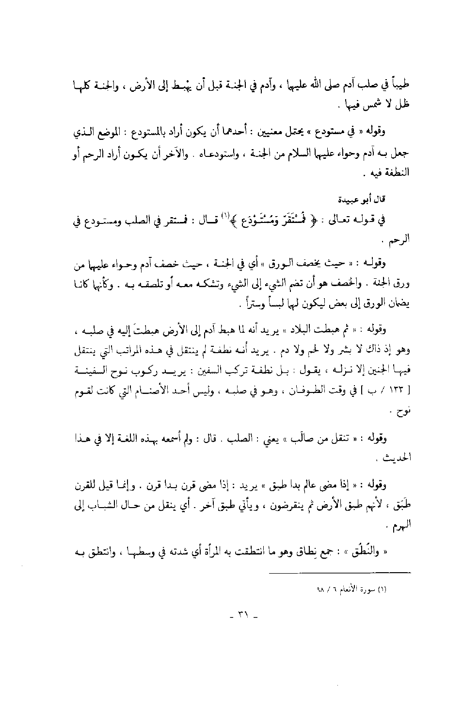 قال أبو عبيدة: في قوله تعالى: " فمستقر ومستودع " قال: فمستقر في الصلب ومستودع في الرحم.