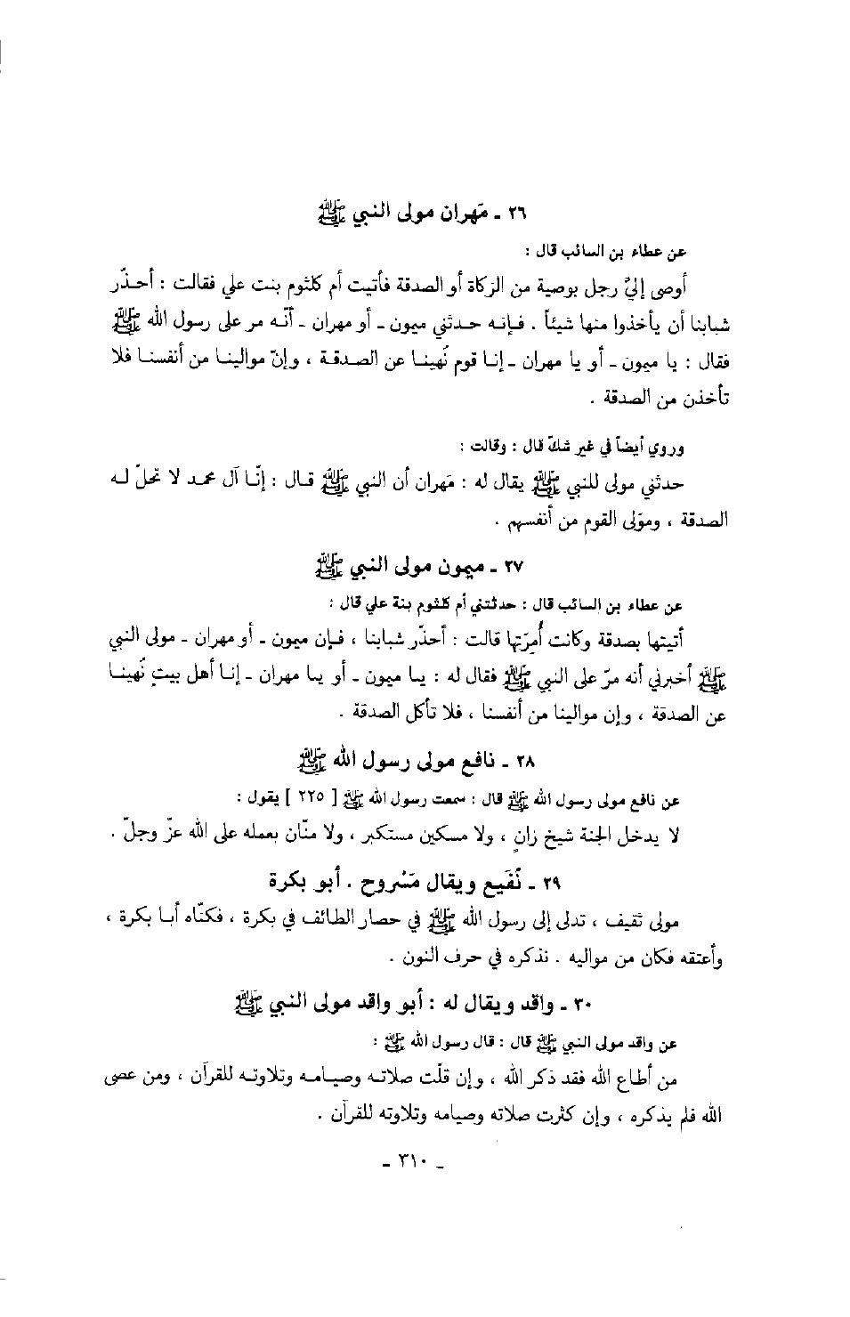 عن عطاء بن السائب قال: أوصى إليّ رجل بوصيّة من الزكاة أو الصدقة فأتيت أم كلثوم بنت علي فقالت: أحذّر شبابنا أن يأخذوا منها شيئاً. فإنه حدثني ميمون - أو مهران - أنه مرّ على رسول الله صَلَّى اللهُ عَلَيْهِ وَسَلَّمَ فقال: يا ميمون - أو يامهران - إنا قومٌ نهينا عن الصدقة، وإن موالينا من أنفسنا فلا تأخذن من الصدقة. وروي أيضاً من غير شكٍ قال: وقالت: حدّثني مولى للنبي صَلَّى اللهُ عَلَيْهِ وَسَلَّمَ يقال له: مهران أنّ النبي صَلَّى اللهُ عَلَيْهِ وَسَلَّمَ قال: إنا آل محمد لا تحل له الصدقة، ومولى القوم من أنفسهم.