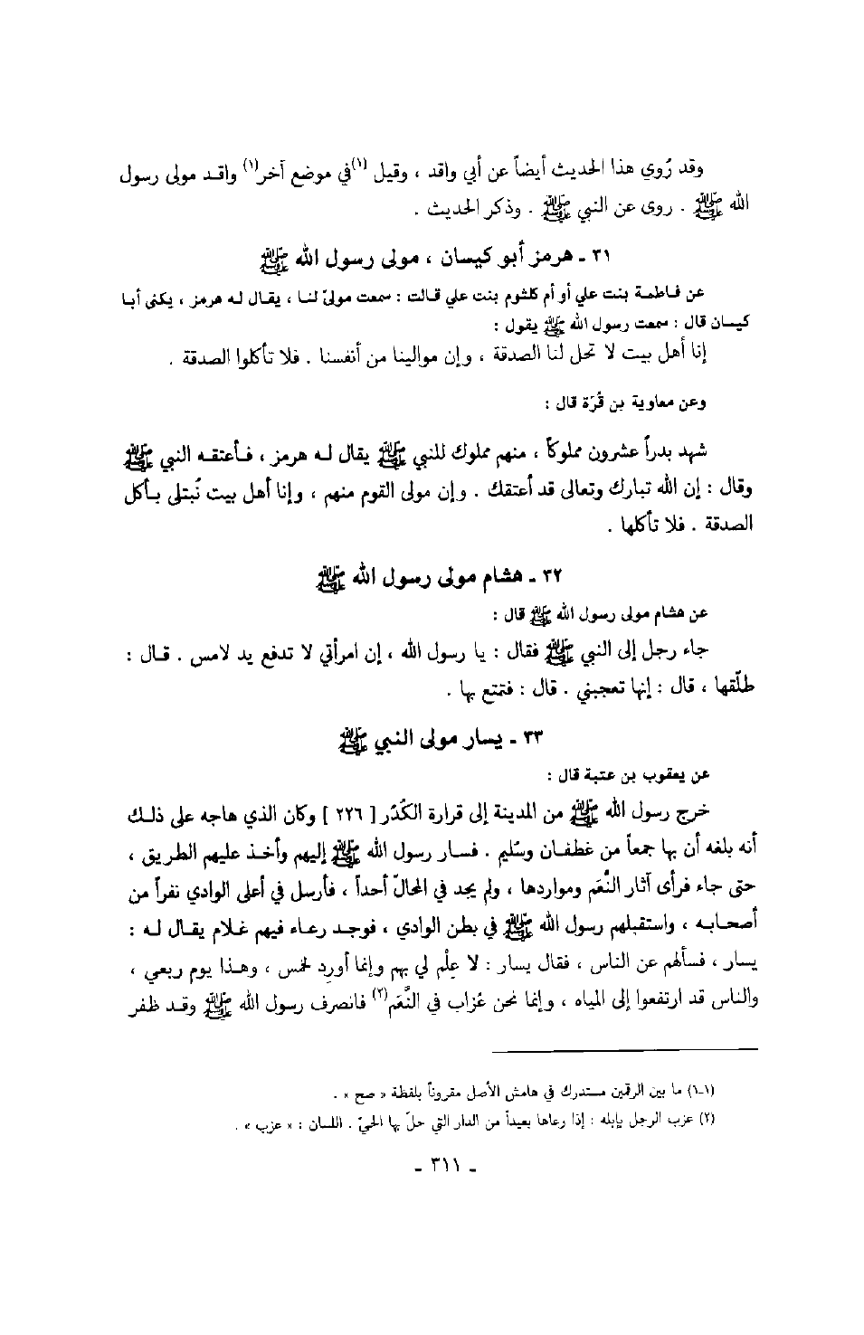 عن فاطمة بنت علي أو أم كلثوم بنت علي قالت: سمعت مولىً لنا، يقال له هرمز، يكنى أبا كيسان قال: سمعت رسول الله صَلَّى اللهُ عَلَيْهِ وَسَلَّمَ يقول: إنا أهل بيت لا تحلّ لنا الصدقة، وإن موالينا من أنفسنا، فلا تاكلوا الصدقة. وعن معاوية بن قرّة قال: شهد بدراً عشرون مملوكاً. منهم مملوك للنبي صَلَّى اللهُ عَلَيْهِ وَسَلَّمَ يقال له هرمز، فأعتقه النبي صَلَّى اللهُ عَلَيْهِ وَسَلَّمَ وقال: إن الله تبارك وتعالى قد أعتقك. وإن مولى القوم منهم، وإنا أهل بيت نبتلى بأكل الصدقة. فلا تأكلها.