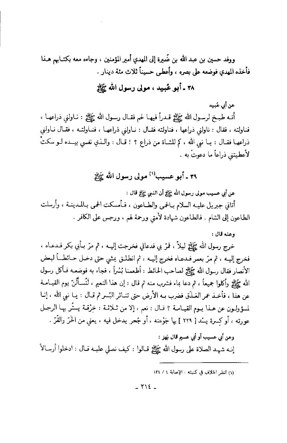 عن أبي عسيب مولى رسول الله صَلَّى اللهُ عَلَيْهِ وَسَلَّمَ أن النبي صَلَّى اللهُ عَلَيْهِ وَسَلَّمَ قال: أتاني جبريل عليه السلام بالحمى والطاعون، فأمسكت بالحمى بالمدينة، وأرسلت الطاعون إلى الشام، فالطاعون شهادة لأمتي ورحمة لهم، ورجس على الكافر. وعنه قال: خرج رسول الله صَلَّى اللهُ عَلَيْهِ وَسَلَّمَ ليلاً، فمرّ بي فدعاني فخرجت إليه، ثم انطلق يمشي حتى دخل حائطاً لبعض الأنصار فقال رسول الله صَلَّى اللهُ عَلَيْهِ وَسَلَّمَ لصاحب الحائط: أطعمنا بسراً، فجاء فجاء به فوضعه فأكل رسول الله صَلَّى اللهُ عَلَيْهِ وَسَلَّمَ وأكلوا جميعاً، ثم دعا بماء فشرب منه ثم قال: إن هذا النعيم لتسألن يوم القيامة عن هذا،، فأخذ عمر العذق فضرب به الأرض حتى تناثر البسر ثم قال: يا نبي الله، إنا لمسؤولون عن هذا يوم القيامة؟ قال: نعم، إلا من ثلاثة: خرقة يستر بها الرجل عورته، أو كسرة يسد بها بها جوعته، أو حجر يدخل فيه، يعني من الحر والقرّ. وعن أبي عسيب أو أبي عسيم قال بهز: إنه شهد الصلاة على رسول الله قالوا: كيف نصلي عليه قال: ادخلوا أرسالاً