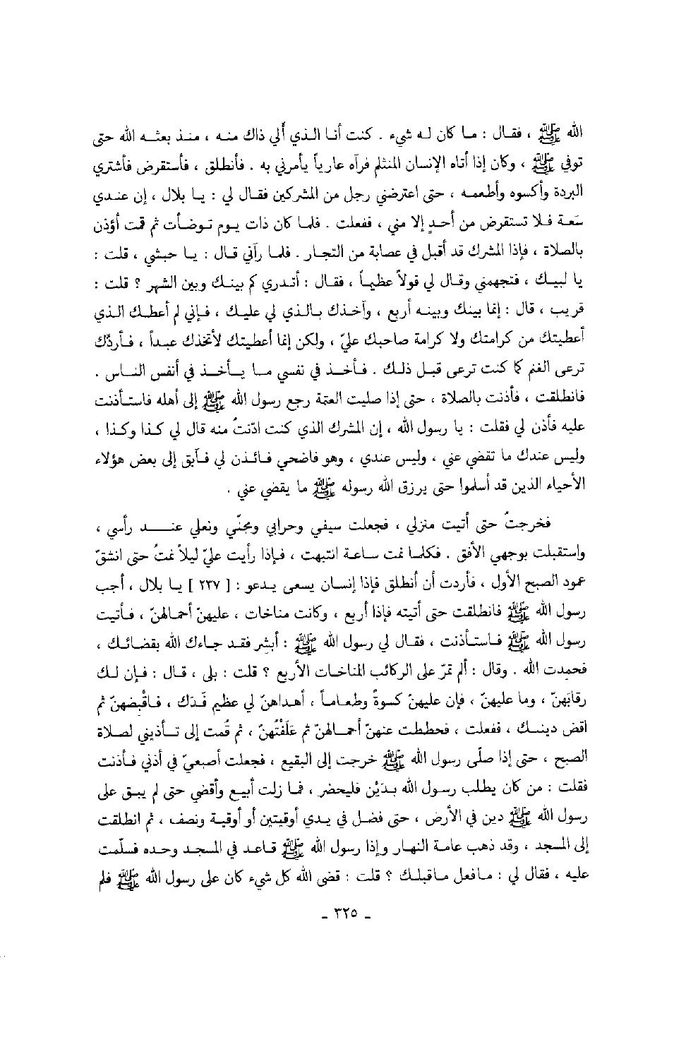 الله صَلَّى اللهُ عَلَيْهِ وَسَلَّمَ، فقال: ما كان له شيء. كنت أنا الذي ألي ذاك منه، منذ بعثه الله حتى توفي صَلَّى اللهُ عَلَيْهِ وَسَلَّمَ، وكان إذا أتاه الإنسان المتثلم فرآه عارياً يأمرني به. فانطلق، فاستقرض فأشتري البردة فأكسوه وأطعمه، حتى اعترضني رجل من المشركين فقال لي يا بلال، إن عندي سعة فلا تستقرض من أحد إلا مني ففعلت. فلما كان ذات يوم توضأت ثم قمت أؤذن بالصلاة، فإذا المشرك قد أقبل في عصابة من التجار. فلما رآني قال: يا حبشي، قلت: يالبيك، فتجهمني وقال لي قولاً عظيماً فقال أتدري كم بينك وبين الشهر؟ قلت: قريب، قال: إنما بينك وبينه أربعة، وآخذك بالذي لي عليك، فإني لم أعطيك الذي أعطيتك من كرامتك ولا كرامة صاحبك علي، ولكن إنما أعطيتك لأتخذك عبداً، فأردك ترعى الغنم كما كنت ترعى قبل ذلك. فأخذ في نفسي ما يأخذ في أنفس الناس. فانطلقت، فأذنت بالصلاة، حتى إذا صليت العتمة رجع رسول الله إلى أهله فاستأذنت عليه فأذن لي فقلت: يا رسول الله، إن المشرك الذي كنت أدنت منه قال لي كذا وكذا، وليس عندك ما تقضي عني، وليس عندي، وهو فاضحي فأذن لي فأبق إلى بعض هؤلاء الأحياء الذين قدأسلموا حتى يرزق الله رسوله ما يقضي عني. فخرجت حتى أتيت منزلي، فجعلت سيفي وحرابي ومجني ونعلي عند رأسي، واستقبلت في بوجهي الأفق. فكلما نمت ساعة انتبهت، فإذا رأيت علي ليلاً نمت حتى انشق عمود الصبح الأول، فأردت أن أنطلق فإذا إنسان يسعى يدعو: يا بلال، أجب رسول الله فانطلقت حتى أتيته فإذا أربع، وكانت مناخات، عليهن أحمالهن، فأتيت رسول الله صَلَّى اللهُ عَلَيْهِ وَسَلَّمَ فاستأذنت، فقال لي رسول الله صَلَّى اللهُ عَلَيْهِ وَسَلَّمَ: أبشر فقد جاءك الله بقضائك، فحمدت الله. وقال: ألم تمر على الركائب المناخات الأربع؟ قلت: بلى، قال: فلأن لك رقابهن، وما عليهن، فإن عليهن كسوةً وطعاماً، أهداهن لي عظيم فدك فاقبضهن ثم أقض دينك، ففعلت، فحططت عنهن أحمالهن ثم علفتهن، ثم قمت إلى تأذيني لصلاة الصبح، حتى إذا صلى رسول الله صَلَّى اللهُ عَلَيْهِ وَسَلَّمَ خرجت إلى البقيع، فجعلت إصبعي في أذني فأذنت فقلت: من كان يطلب رسول الله صَلَّى اللهُ عَلَيْهِ وَسَلَّمَ بدين فليحضر، فما زلت أبيع وأقضي حتى لم يبقى على رسول الله صَلَّى اللهُ عَلَيْهِ وَسَلَّمَ دين في الأرض حتى فضل في يدي أوقيتن أو أوقية ونصف، ثم انطلقت إلى المسجد وقد ذهب عامة النهار وإذا رسول الله صَلَّى اللهُ عَلَيْهِ وَسَلَّمَ قاعد في المسجد وحده فسلمت عليه، فقال لي: ما فعل ما قبلك؟ قلت: قضى الله كل شيء كان على رسول الله صَلَّى اللهُ عَلَيْهِ وَسَلَّمَ فلم