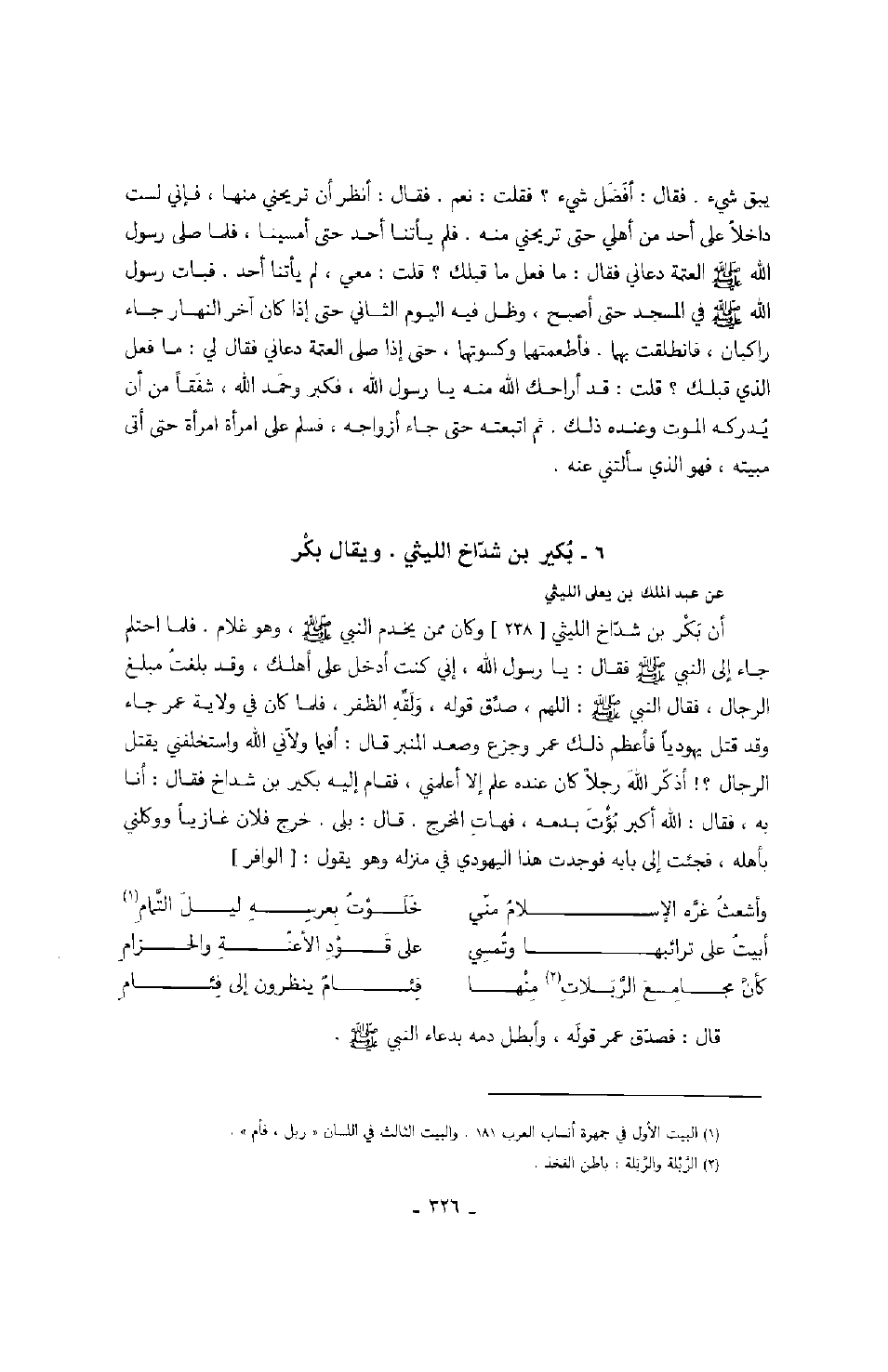 عن عبد الملك بن يعلى الليثي أن بكر بن شداخ الليثي وكان ممن يخدم النبي صَلَّى اللهُ عَلَيْهِ وَسَلَّمَ، وهو غلام. فلما احتلم جاء إلى النبي صَلَّى اللهُ عَلَيْهِ وَسَلَّمَ فقال: يا رسول الله، إني كنت أدخل على أهلك، وقد بلغت مبلغ الرجال، فقال النبي: اللهم، صدق قوله، ولقه الظفر، فلما كان في ولاية عمر جاء وقد قتل يهوديا فأعظم ذلك عمر وجذع وصعد المنبر قال: أفيما ولاني الله واستخلفني يقتل الرجال؟! أذكر الله رجلاً كان عنده علم إلا علمني، فقام إليه بكير بن شداخ فقال: أنا به، فقال: الله أكبر بؤت بدمه، فهات المخرج. قال: بلى. خرج فلان غازياً ووكلني بأهله فجئت إلى بابه فوجت هذا اليهودي في منزله وهو يقول: الوافر