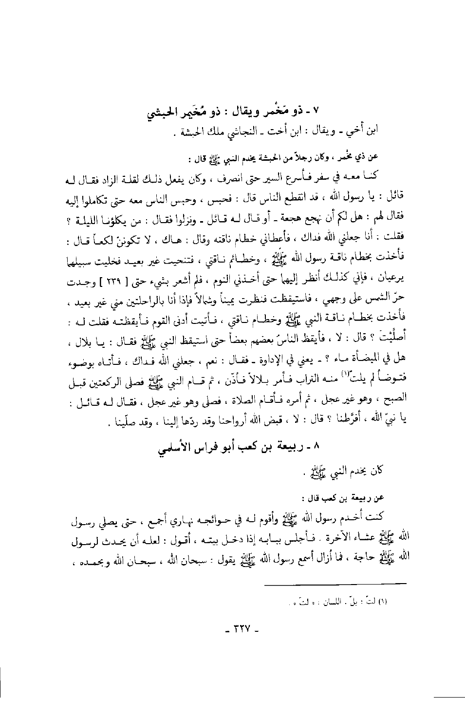 ابن أخي - ويقال ابن أخت النجاشي ملك الحبشة. عن ذي مخمر، وكان رجلاً من الحبشة يخدم النبي قال: كنا معه في سفر فأسرع السير حتى انصرف، وكان يفعل ذلك لقلة الزاد فقال له قائل: يا رسول الله، قد انقطع الناس قال: فحبس، وحبس الناس معه حتى تكاملوا إليه فقال لهم: هل لكم أن نهجه هجعة - أو قال له قائل - فنزلوا فقال: من يكلؤنا الليلة؟ فقلت: أنا جعلني الله فداك، فأعطاني خطام ناقته فقال: هاك لا تكونن لكعاً قال: فأخذت بخطام ناقة رسول الله صَلَّى اللهُ عَلَيْهِ وَسَلَّمَ، وخطائم ناقتي، فتنحيت غير بعيد فخليت سبيلهما يرعيان، فإني كذلك أنظر إليهما حتى أخذني النوم، فلم أشعر بشيء حتى وجدت حر الشمس على وجهي، فاستيقظت فنظرت يميناً وشمالاً فإذا أنا بالراحلتين مني غير بعيد، فأخذت بخطام ناقة النبي صَلَّى اللهُ عَلَيْهِ وَسَلَّمَ وخطام ناقتي، فأتيت أدنى القوم فأيقظته فقلت له: أصليت؟ قال: لا، فأيقظ الناس بعضهم بعضاً حتى استيقظ النبي صَلَّى اللهُ عَلَيْهِ وَسَلَّمَ فقال: يا بلال، هل في الميضأة ماء؟ - يعني في الإداوة - فقال: نعم، جعلني الله فداك، فأتاه بوضوء فتوضأ لم يلت منه التراب فأمر بلالً فأذن، ثم قام النبي صَلَّى اللهُ عَلَيْهِ وَسَلَّمَ فصلى الركعتين قبل الصبح، وهو غير عجل، ثم أمره فأقام الصلاة، فصلى وهو غير عجل، فقال له قائل: يا نبي الله، أفطرنا؟ قال: لا، قبض الله أرواحنا وقد ردها إلينا وقد صلينا.