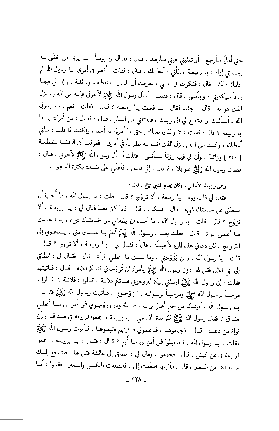 حتى أمل فأرجع، أو تغلبني عيني فأرقد. قال: فقال لي يوماً، لما يرى في خفتي له وخدمتي إياه: يا ربيعة، سلني، أعطك. قال: فقلت: أنظر في أمري يا رسول الله صَلَّى اللهُ عَلَيْهِ وَسَلَّمَ هو أعلمك ذلك. قال: ففكرت في نفسي فعرفت أن الدنيا منقطعة وزائلة، وإن لي فيها رزقاً سيكفيني، ويأتيني، قال: فقلت: أسأل رسول الله صَلَّى اللهُ عَلَيْهِ وَسَلَّمَ لآخرتي فأنه من الله بالمنزل الذي هو به. قال: فجئته فقال: ما فعلت يا ربيعة؟ قال: فقلت: نعم، يا رسول الله، أسألك أن تشفع لي إلى ربك، فيعتقني من النار، قال: فقال: من أمرك بهذا يا ربيعة؟ قال: فقلت: لا والذي بعثك بالحق ما أمرني به أحد، ولكنك لما قلت: سلني أعطك، وكنت من الله بالمنزل الذي أنت به نظرت في أمري، فعرفت أن الدنيا منقطعة0وزائلة، وأن لي فيها رزقاً سيأتيني، فقلت أسأل رسول الله صَلَّى اللهُ عَلَيْهِ وَسَلَّمَ لآخرتي. قال: فصمت رسول الله صَلَّى اللهُ عَلَيْهِ وَسَلَّمَ طويلاً، ثم قال: إني فاعل، فأعني على نفسك بكثرة السجود. وعن ربيعة الأسلمي - وكان يخدم النبي صَلَّى اللهُ عَلَيْهِ وَسَلَّمَ - قال: فقال لي ذات يوم: يا ربيعة، ألا تزوج؟ قال: قلت: يا رسول الله، ما أحب أن يشغلني عن خدمتك شيء. قال: فسكت. قال: فلما كان بعد قال لي: يا ربيعة، ألا تزوج؟ قال: قلت: يا رسول الله صَلَّى اللهُ عَلَيْهِ وَسَلَّمَ، ما أحب أن يشغلني عن خدمتك شيء، وما عندي ما أعطي المرأة فقال: فقلت بعد: رسول الله أعلم بما عندي مني. يدعوني إلى التزويج. لئن دعاني هذه المرة لأجيبنه. قال: فقال لي: يا ربيعة، ألا تزوج؟ قال: قلت: يا رسول الله، ومن يزوجني، وما عندي ما أعطي المرأة. قال: فقال لي: انطلق إلى بني فلان فقل لهم: إن رسول الله صَلَّى اللهُ عَلَيْهِ وَسَلَّمَ يأمركم أن تزوجوني فتاتكم فلانة. قال: فأتيتهم فقلت: إن رسول الله صَلَّى اللهُ عَلَيْهِ وَسَلَّمَ أرسلني إليكم لتزوجوني فتاتكم فلانة. قالوا: فلانة؟. قالوا: مرحباً برسول الله صَلَّى اللهُ عَلَيْهِ وَسَلَّمَ ومرحباً برسوله فزوجوني فأتيت رسول الله صَلَّى اللهُ عَلَيْهِ وَسَلَّمَ فقلت: يا رسول الله، أتيتك من خير أهل بيت، صدقوني وزوجوني فمن أين لي ما أعطي صداقي؟ فقال رسول الله صَلَّى اللهُ عَلَيْهِ وَسَلَّمَ لبريدة الأسلمي: يا بريدة، اجمعوا لربيعة في صداقه وزن نواة من ذهب. قال: فجمعوها، فأعطوني فأتيتهم فقبلوها، فأتيت رسول الله صَلَّى اللهُ عَلَيْهِ وَسَلَّمَ فقلت: يا رسول الله، قد قبلوا فمن أين لي ما أولم؟ قال: فقال: اجمعوا لربيعة في ثمن كبش. قال: فجمعوا. وقال لي: انطلق إلى عائشة فقل لها: فلتدفع إليك ما عندها من الشعير، قال: فأتيتها فدفعت إلي. فانطلقت بالكبش والشعير، فقالوا: أما