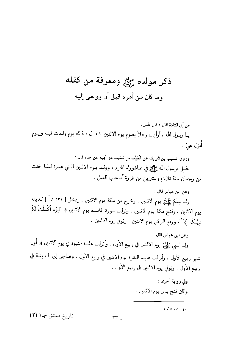 وعن ابن عباس قال: ولد النبي صَلَّى اللهُ عَلَيْهِ وَسَلَّمَ في ربيع الأول، وأنزلت عليه النبوة في يوم الاثنين في أول شهر ربيع الأول، وأنزلت عليه البقرة يوم الاثنين في ربيع الأول. وهاجر إلى المدينة في ربيع الأول، وتوفي يوم الاثنين في ربيع الأول.