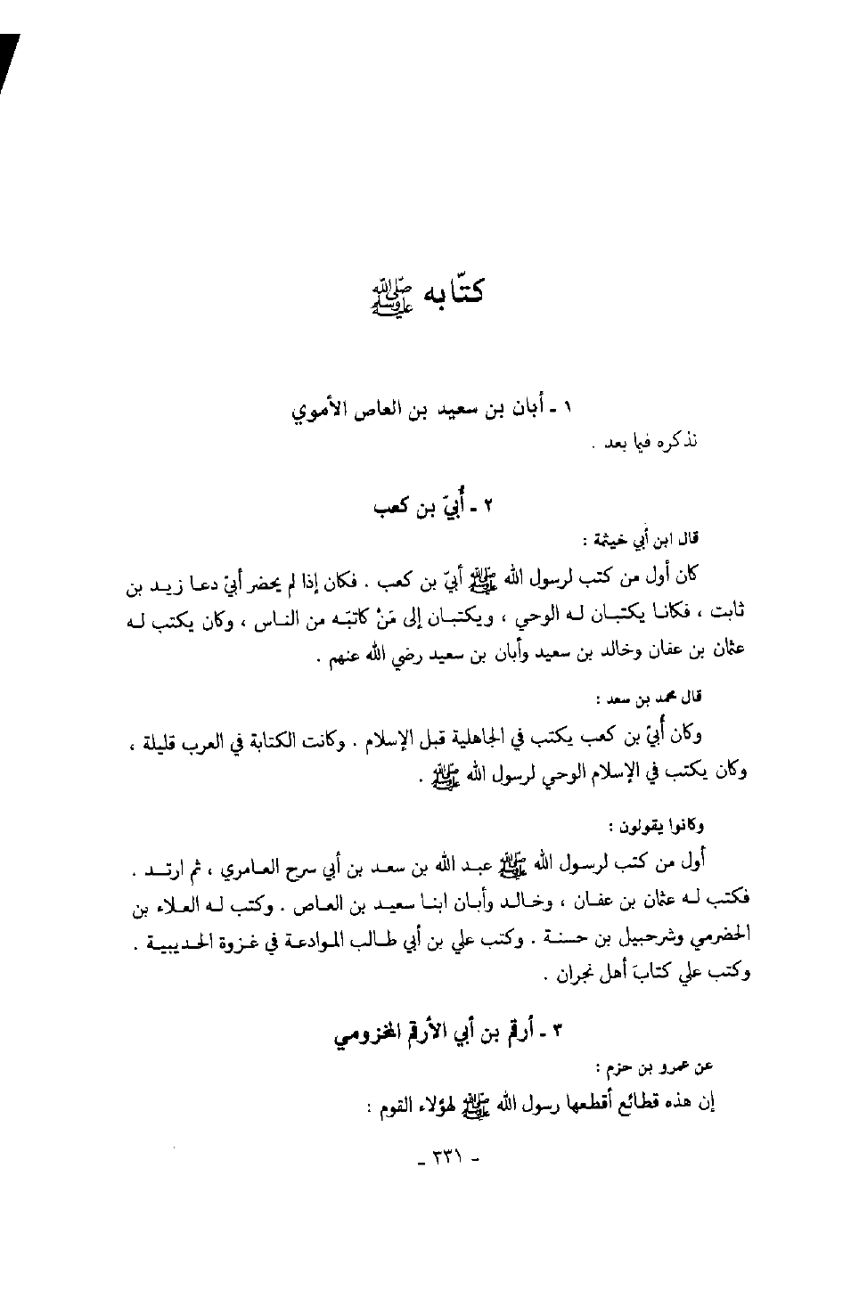 قال ابن أبي خثيمة: كان أول من كتب لرسول الله صَلَّى اللهُ عَلَيْهِ وَسَلَّمَ أبي بن كعب. فكان إذا لم يحضر أبي دعا زيد بن ثابت، فكانا يكتبان له الوحي، ويكتبان إلى من كاتبه من الناس، وكان يكتب له عثمان بن عفان وخالد بن سعيد وأبان بن سعيد رضي الله عنهم. قال محمد بن سعد: وكان أبي بن كعب يكتب في الجاهلية قبل الإسلام. وكانت الكتابة في العرب قليلة، وكان يكتب في الإسلام الوحي لرسول الله صَلَّى اللهُ عَلَيْهِ وَسَلَّمَ. وكانوا يقولون: أول من كتب لرسول الله صَلَّى اللهُ عَلَيْهِ وَسَلَّمَ عبد الله بن سعد بن أبي سرح العامري، ثم ارتد. فكتب له عثمان بن عفان، وخالد وأبان ابنا سعيد بن العاص. وكتب له العلاء بن الحضرمي وشرحبيل بن حسنة. وكتب على بن أبي طالب الموادعة في غزوة الحديبية. وكتب علي كتاب أهل نجران.