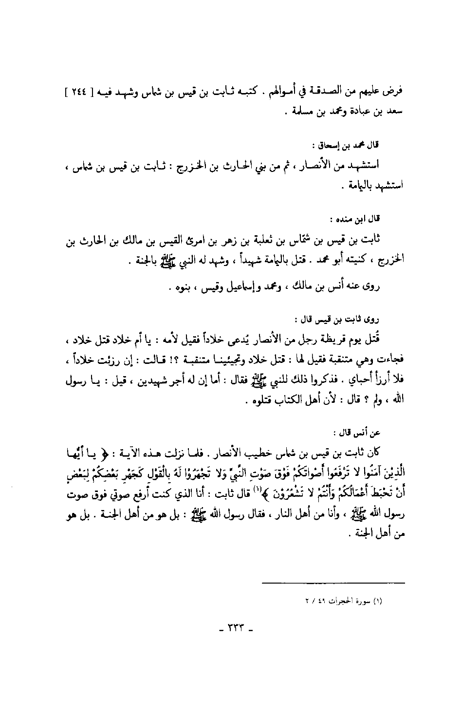 فرض عليهم من الصدقة في أموالهم، كتبه ثابت بن قيس بن شمام وشهد فيه سعد بن عبادة ومحمد بن مسلمة. قال محمد بن اسحاق: استشهد من الأنصار، ثم من بني الحارث بن الخزرج: ثابت بن قيس بن شماس استشهد باليمامة. قال ابن منده: ثابت بن قيس بن شماس بن ثعلبة بن زهر بن امرئ القيس بن مالك بن الحارث بن الخزرج، كنيته أبو محمد. قتل باليمامة شهيداً، وشهد له النبي صَلَّى اللهُ عَلَيْهِ وَسَلَّمَ بالجنة. روى عنه أنس بن مالك، ومحمد وإسماعيل وقيس، بنوه. روى ثابت بن قيس قال: قتل يوم قريظة رجل من الأنصار يدعى خلاداً فقيل لأمه: يا أم خلاد قتل خلاد، فجاءت وهي متنقبة فقبل لها: قتل خلاد وتجيئينا متنقبة قالت: لإن رزئت خلاداً، فلا أرزأ أحباي. فذكروا ذلك للنبي فقال: أما أن له أجر شهيدين، قيل: يا رسول الله ولم؟ قال: لأن أهل الكتاب قتلوه. عن أنس قال: كان ثابت بن قيس بن شماس خطيب الأنصار. فلما نزلت الآية " يا أيها الذين آمنوا لا ترفعوا أصواتكم فوق صوت النبي ولا تجهروا له بالقول كجهر بعضكم لبعضٍ أن تحبط أعمالكم وأنتم لا تشعرون " قال ثابت: أنا الذي كنت أرفع صوتي فوق صوت رسول الله صَلَّى اللهُ عَلَيْهِ وَسَلَّمَ، وأنا من أهل النار، فقال رسول الله صَلَّى اللهُ عَلَيْهِ وَسَلَّمَ: بل هو من أهل الجنة.