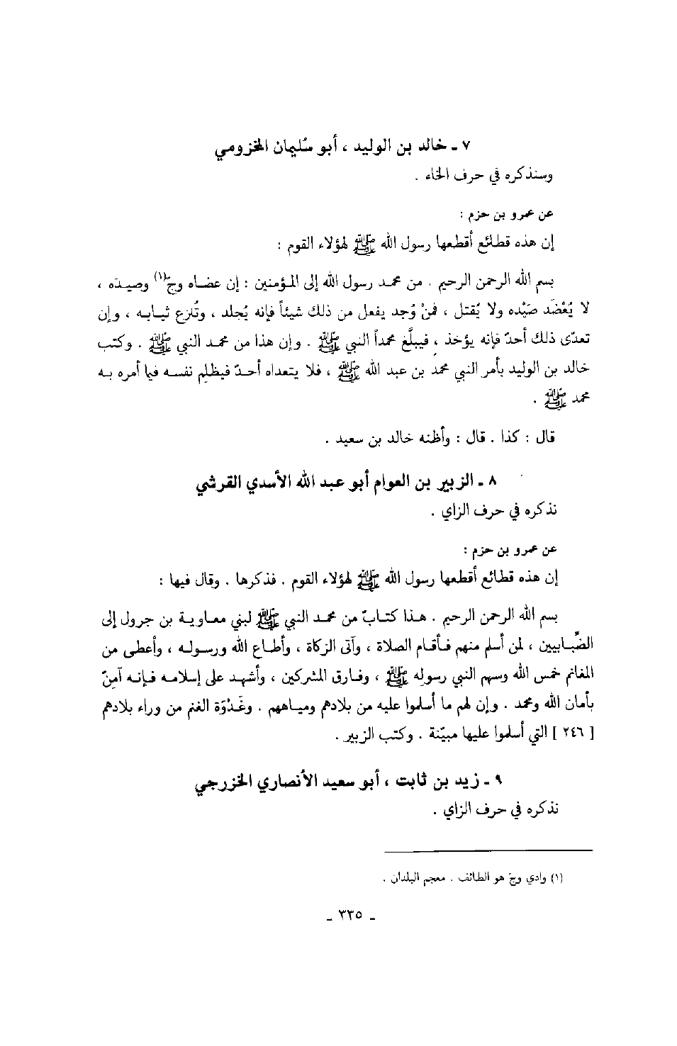 وسنذكره في حرف الخاء. عن عمرو بن حزم: إن هذه قطائع أقطعها رسول الله صَلَّى اللهُ عَلَيْهِ وَسَلَّمَ لهؤلاء القوم: بسم الله الرحمن الرحيم. من محمد رسول الله صَلَّى اللهُ عَلَيْهِ وَسَلَّمَ إلى المؤمنين: إن عضاه وجّ وصيده، لا يعضد صيده ولا يقتل، فمن وجد يفعل من ذلك شيئاً فإنه يجلد، وتنزع ثيابه، وإن تعدى ذلك أحد فإنه يؤخذ، فيبلغ محمداً النبي صَلَّى اللهُ عَلَيْهِ وَسَلَّمَ. وإن هذا من محمد النبي صَلَّى اللهُ عَلَيْهِ وَسَلَّمَ. وكتب خالد بن الوليد بأمر النبي محمد بن عبد الله صَلَّى اللهُ عَلَيْهِ وَسَلَّمَ، فلا يتعداه أحد فيظلم نفسه فيما أمره به محمد صَلَّى اللهُ عَلَيْهِ وَسَلَّمَ. قال: كذا. قال: وأظنه خالد بن سعيد.