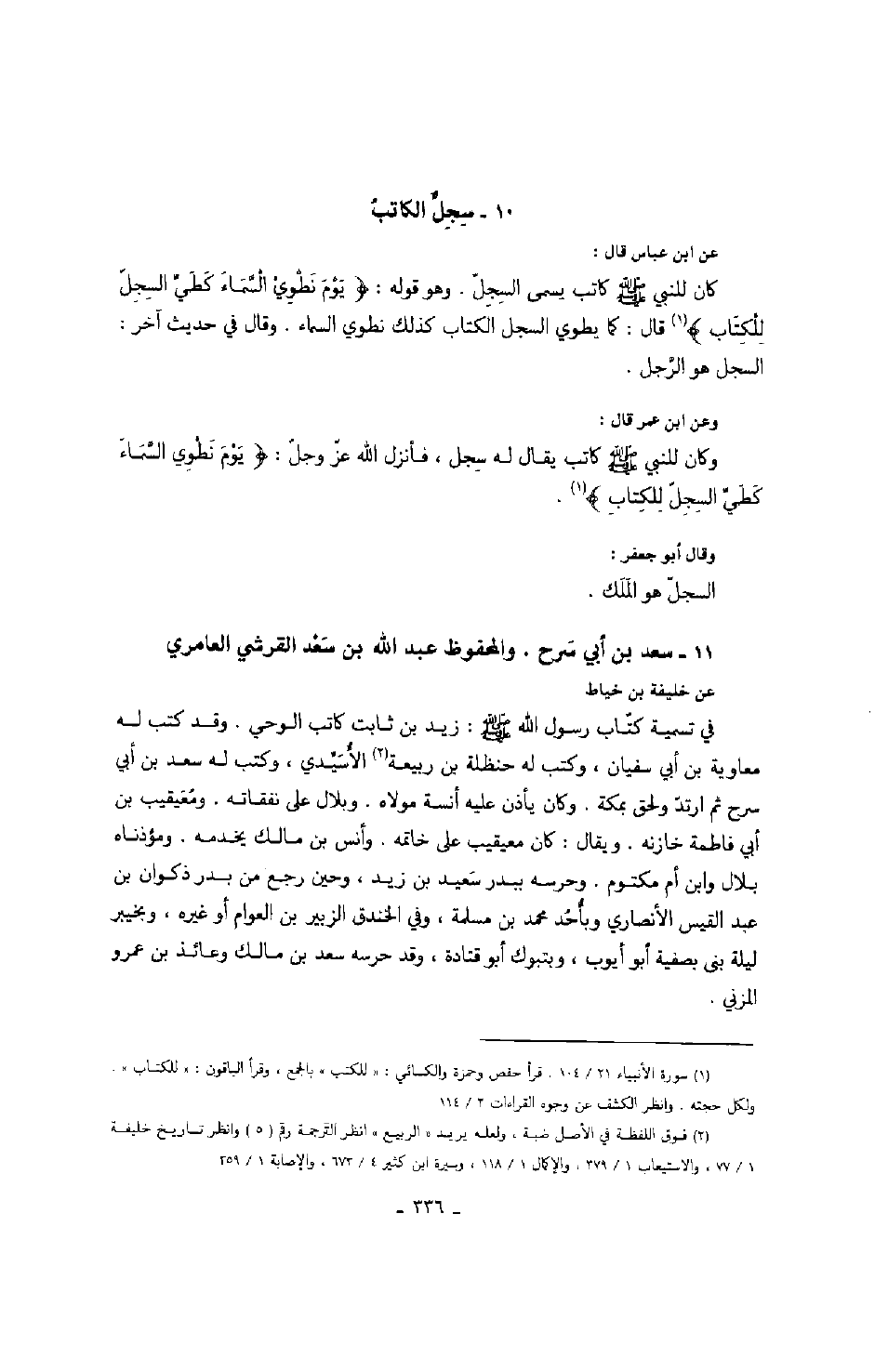 عن ابن عباس قال: كان النبي كاتب يسمى السجل. وهو فوله: " يوم نطوي السماء كطي السجل للكتاب " قال: كما يطوي السجل الكتاب كذلك نطوي السماء. وقال في حديث آخر: السجل هو الرجل. وعن ابن عمرو قال: وكان للنبي كاتب يقال له سجل، فأنزل الله عز وجل: " يوم نطوي السماء كطي السجل للكتاب ". وقال أبو جعفر: السجل هو الملك
