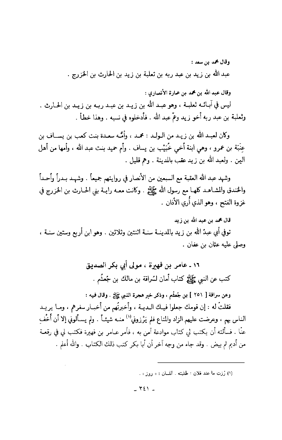 كتب عن النبي كتاب أمان لسراقة بن مالك بن جعشم. وعن سراقة بن جعشم، وذكر خبر الهجرة النبي صَلَّى اللهُ عَلَيْهِ وَسَلَّمَ. وقال فيه: فقلت له: إن قومك جعلوا فيك الدية، وأخبرتهم من أخبار سفرهم، وما يريد الناس بهم، وعرضت عليهم الزاد والمتاع فلم يرزوني منه شيئاً. ولم يسألوني إلا أن أخف عنا. فسألته أن يكتب لي كتاب موادعة آمن به، فأمر عامر بن فهيرة فكتب لي في رقعة من أديم ثم بيض. وقد جاء من وجه آخر أن أبا بكر قد كتب ذلك الكتاب. والله أعلم.