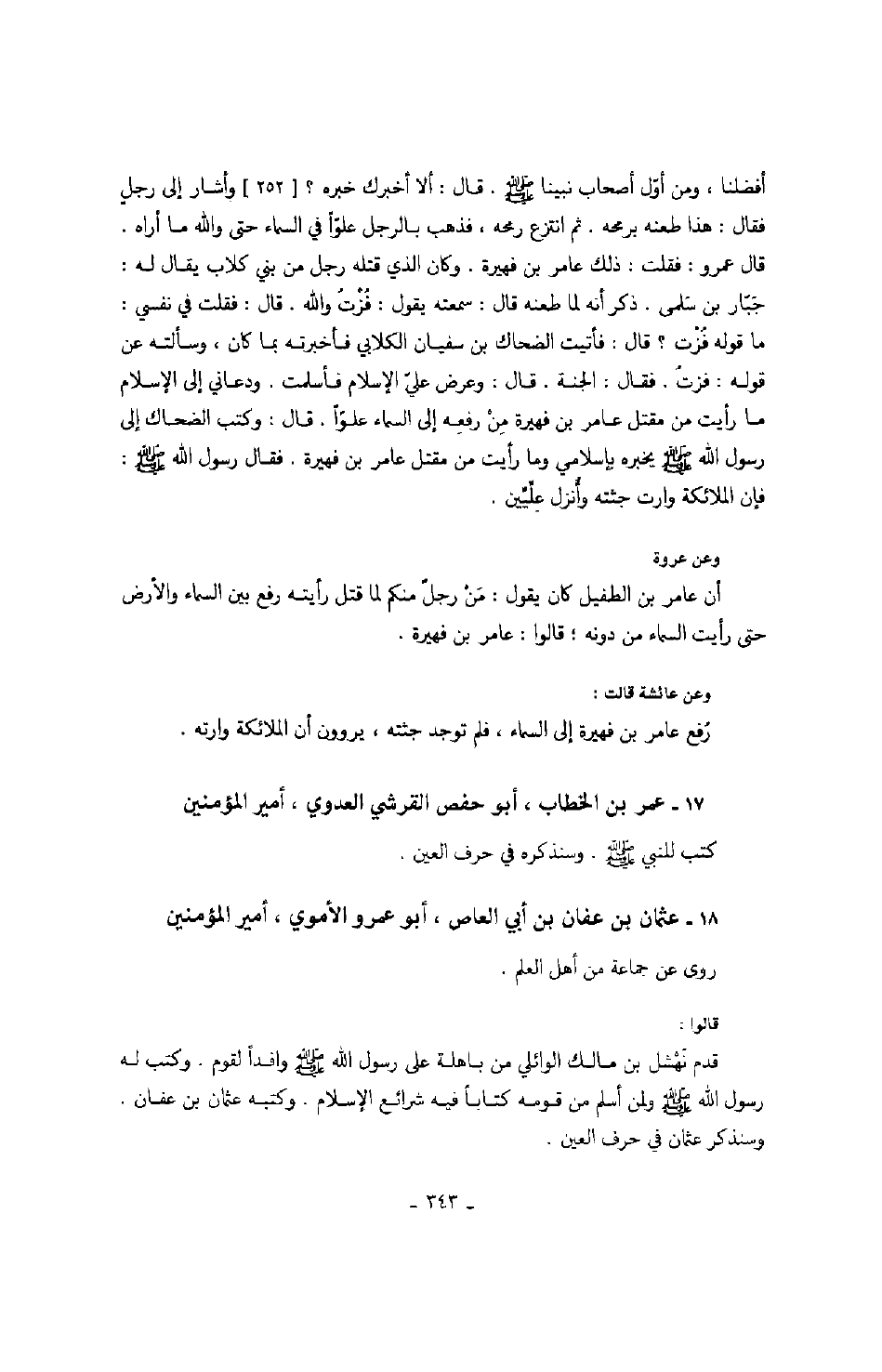 أفضلنا، ومن أول أصحاب نبينا. وقال: ألا أخبرك خبره؟ وأشار إلى رجل فقال: هذا طعنه وبرمحه. ثم انتزع رمحه، فذهب بالرجل علواً في السماء حتى والله ما أراه. قال عمرو فقلت: ذلك عامر بن فهيرة. وكان الذي قتله رجل من بني كلاب يقال له: جبار بن سلمى. ذكر أنه لما طعنه قال: سمعته يقول: فزت والله. قال: فقلت في نفسي: ما أقوله فزت؟ قال: فأتيت الضحاك بن سفيان الكلابي فأخبرته بما كان، وسألته عن قوله: فزت. فقال: الجنة. قال: وعرض علي الإسلام فأسلمت. ودعاني إلى الإسلام ما رأيت من مقتل عامر بن فهيرة من رفعه إلى السماء علواً. قال: وكتب الضحاك إلى رسول الله يخبره بإسلامه وما رأيت من مقتل عامر بن فهيرة. فقال رسول الله: فإن الملائكة وارت جثته وأنزل عليين. وعن عروة أن عامر بن الطفيل كان يقول: من رجل منكم لما قتل رأيته رفع بين السماء والأرض حتى رأيت السماء من دونه؛ قالوا: عامر بن فهيرة. وعن عائشة قالت: رفع عامر بن فهيرة إلى السماء، فلم توجد جسته، يروون أن الملائكة وارته.