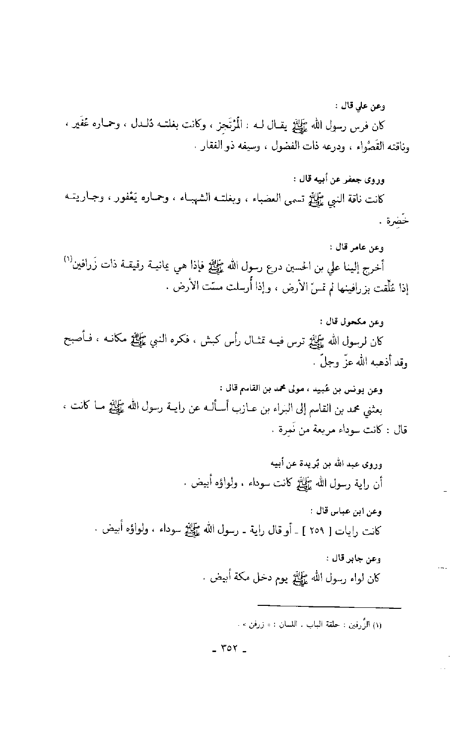 وعن عامر قال: أخرج إلينا علي بن الحسين درع رسول الله صَلَّى اللهُ عَلَيْهِ وَسَلَّمَ فإذا هي يمانية رقيقة ذات زرافين إذا علقت بزرافينها لم تمس الأرض، وإذا أرسلت مست الأرض. وعن مكحول قال: كان لرسول الله صَلَّى اللهُ عَلَيْهِ وَسَلَّمَ ترس فيها تمثال رأس كبش، فكره النبي صَلَّى اللهُ عَلَيْهِ وَسَلَّمَ مكانه، فأصبح وقد أذهبه الله عز وجل. وعن يونس بن عبيد، مولى محمد بن القاسم قال: بعثني محمد بن القاسم إلى البراء بن عازب أسأله عن راية رسول الله صَلَّى اللهُ عَلَيْهِ وَسَلَّمَ ما كانت، قال: كانت سوداء مربعة من نمرة. وروى عبد الله بن بريدة عن أبيه أن راية رسول الله صَلَّى اللهُ عَلَيْهِ وَسَلَّمَ كانت سوداء، ولواؤه أبيض. وعن ابن عباس قال: كانت رايات - أو قال راية - رسول الله صَلَّى اللهُ عَلَيْهِ وَسَلَّمَ سوداء، ولواؤه أبيض. وعن جابر قال: كان لواء رسول الله صَلَّى اللهُ عَلَيْهِ وَسَلَّمَ يوم دخل مكة أبيض.