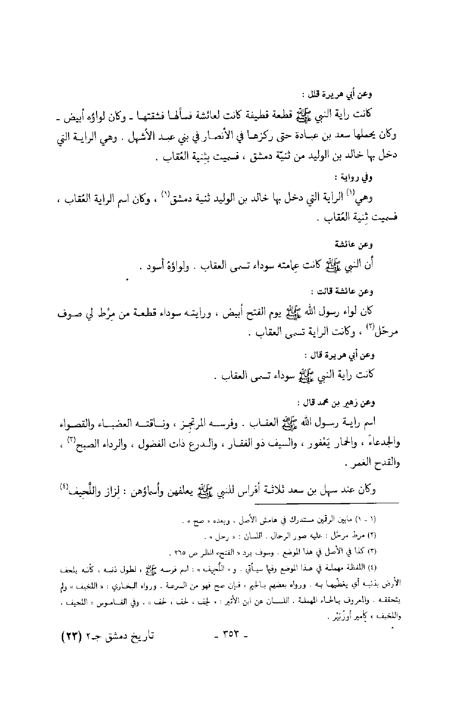 وعن أبي هريرة قال: كانت راية النبي صَلَّى اللهُ عَلَيْهِ وَسَلَّمَ قطعة قطيفة كانت لعائشة فسألها فشقتها - وكان لواؤه أبيض - وكان يحملها سعد بن عبادة حتى ركزها في الأنصار في بني عبد الأشهل. وهي الراية التي دخل بها خالد بن الوليد ثنية دمشق، فسميت بثنية العقاب. وفي روايه: وهي الراية التي دخل بها خالد بن الوليد ثنية دمشق، وكان اسم الراية العقاب، فسميت ثنية العقاب. وعن عائشة أن النبي صَلَّى اللهُ عَلَيْهِ وَسَلَّمَ كانت عمامته سوداء تسمى العقاب. ولواؤه أسود. وعن عائشة قالت: كان لواء رسول الله صَلَّى اللهُ عَلَيْهِ وَسَلَّمَ يوم الفتح أبيض، ورايته قطعة من مرط لي صوف مرحّل، وكانت الراية تسمى العقاب. وعن أبي هريرة قال: كانت رايه النبي صَلَّى اللهُ عَلَيْهِ وَسَلَّمَ سوداء تسمى العقاب. وعن زهير بن محمد قال: اسم راية رسول الله صَلَّى اللهُ عَلَيْهِ وَسَلَّمَ العقاب. وفرسه المرتجز، وناقته العضباء والقصواء والجوعاء، والحمار يعفور، والسيف ذو الفقار، والدرع ذات الفضول، والرداء الصبح، والقدح الغمر. وكان عند سهل بن سعد ثلاثة أفراس للنبي صَلَّى اللهُ عَلَيْهِ وَسَلَّمَ يعلفهن وأسماؤهن: لزاز واللحيف
