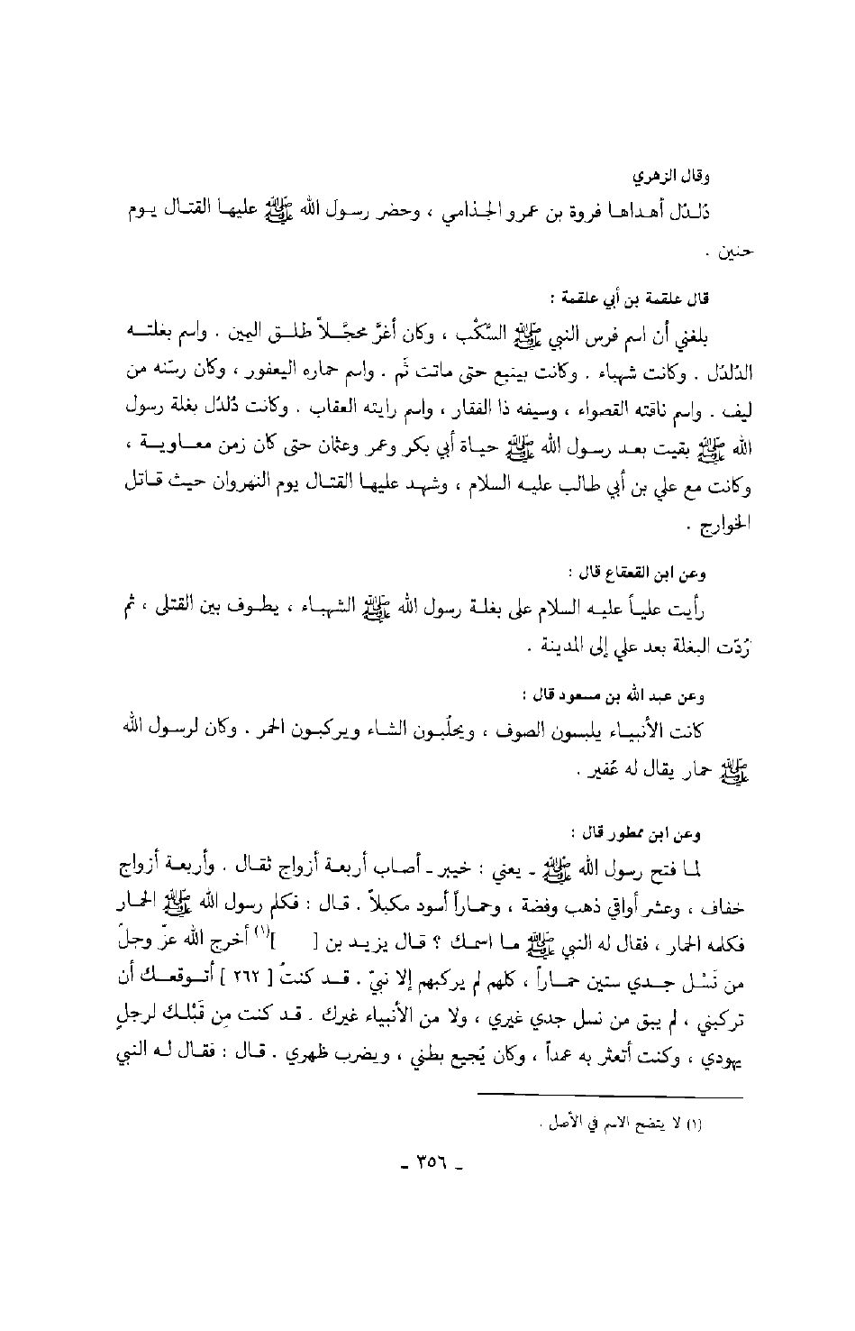 وعن ابن ممطور قال: لما فتح رسول الله صَلَّى اللهُ عَلَيْهِ وَسَلَّمَ - يعني خبير - أصاب أربعة أزواج ثقال. وأربعة أزواج خفاف، وعشر أواقي ذهب وفضة، وحماراً أسوداً مكبلاً. قال: فكلم رسول الله صَلَّى اللهُ عَلَيْهِ وَسَلَّمَ الحمار فكلمه الحمار، فقال له النبي صَلَّى اللهُ عَلَيْهِ وَسَلَّمَ ما اسمك؟ قال يزيد بن أخرج الله عز وجل من نسل جدي ستين حماراً، كلهم لم يركبهم إلا نبي. قد كنت أتوقعك أن تركبني، لم يبق من نسل جدي غيري، ولا من الأنبياء غيرك. قد كنت من قبلك لرجل يهودي، وكنت أتعثر به عمداً، وكان يجيع بطني، ويضرب ظهري. قال: فقال له النبي صَلَّى اللهُ عَلَيْهِ وَسَلَّمَ: