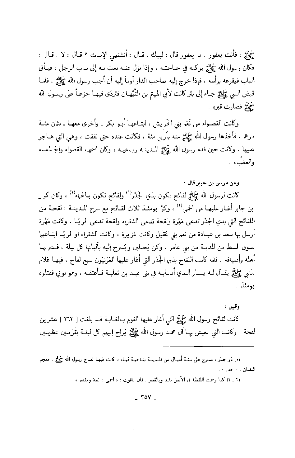 فأنت يعفور. يا يعفورقال: لبيك. قال: أتشتهي الإناث؟ قال: لا. قال: فكان رسول الله صَلَّى اللهُ عَلَيْهِ وَسَلَّمَ يركبه في حاجته، وإذا نزل عنه بعث به إلى باب الرجل، فيأتي الباب فيقرعه بنفسه، فإذا خرج إليه صاحب الدار أومأ أن أجب رسول الله صَلَّى اللهُ عَلَيْهِ وَسَلَّمَ. فلما قبض النبي صَلَّى اللهُ عَلَيْهِ وَسَلَّمَ جاء إلى بئر كانت لأبي الهيثم بن التيهان فتردى فيها جزعاً على رسول الله صَلَّى اللهُ عَلَيْهِ وَسَلَّمَ فكانت قبره. وكانت القصواء من نعم بني الحريش، ابتاعها أبو بكر - وأخرى معها - بثمان مئة درهم، فأخذها رسول الله صَلَّى اللهُ عَلَيْهِ وَسَلَّمَ منه بأربع مئة، فكانت عنده حتى نفقت، وهي التي هاجر عليها. وكانت حين قدم رسول الله صَلَّى اللهُ عَلَيْهِ وَسَلَّمَ المدينة رباعية، وكان اسمها القصواء والجدعاء والعضباء. وعن موسى بن جبير قال: كانت لرسول الله صَلَّى اللهُ عَلَيْهِ وَسَلَّمَ لقائح تكون بذي الجدر ولقائح تكون بالحماء، وكان كرز ابن جابر أغار عليها من الحمى، وكر يومئذ ثلاث لقائح مع سرح المدينة: لقحة من اللقائح التي بذي الجدر تدعى مهرة ولقحة تدعى الشقراء ولقحة تدعى الريا. وكانت مهرة أرسل بها سعد بن عبادة من نعم بني عقيل وكانت غزيرة، وكانت الشقراء أو الريا ابتاعهما بسوق النبط من المدينة من بني عامر. وكن يحتلبن ويسرح إليه بألبانها كل ليلة، فيشربها أهله وأضيافه. فلما كانت اللقاح بذي الجدر التي أغار عليها العرنيون سبع لقاح، فيها غلام لرسول الله صَلَّى اللهُ عَلَيْهِ وَسَلَّمَ يقال له يسار الذي أصابه في بني عبد بن ثعلبة فأعتقه، وهو نوبي فقتلوه يومئذ. وقيل كانت لقائح رسول الله صَلَّى اللهُ عَلَيْهِ وَسَلَّمَ التي أغار عليها القوم بالغابة التي بلغت عشرين لقحة. وكانت التي يعيش بها آل محمد رسول الله صَلَّى اللهُ عَلَيْهِ وَسَلَّمَ يراح إليهم كل ليلة بقريتين عظيمتين