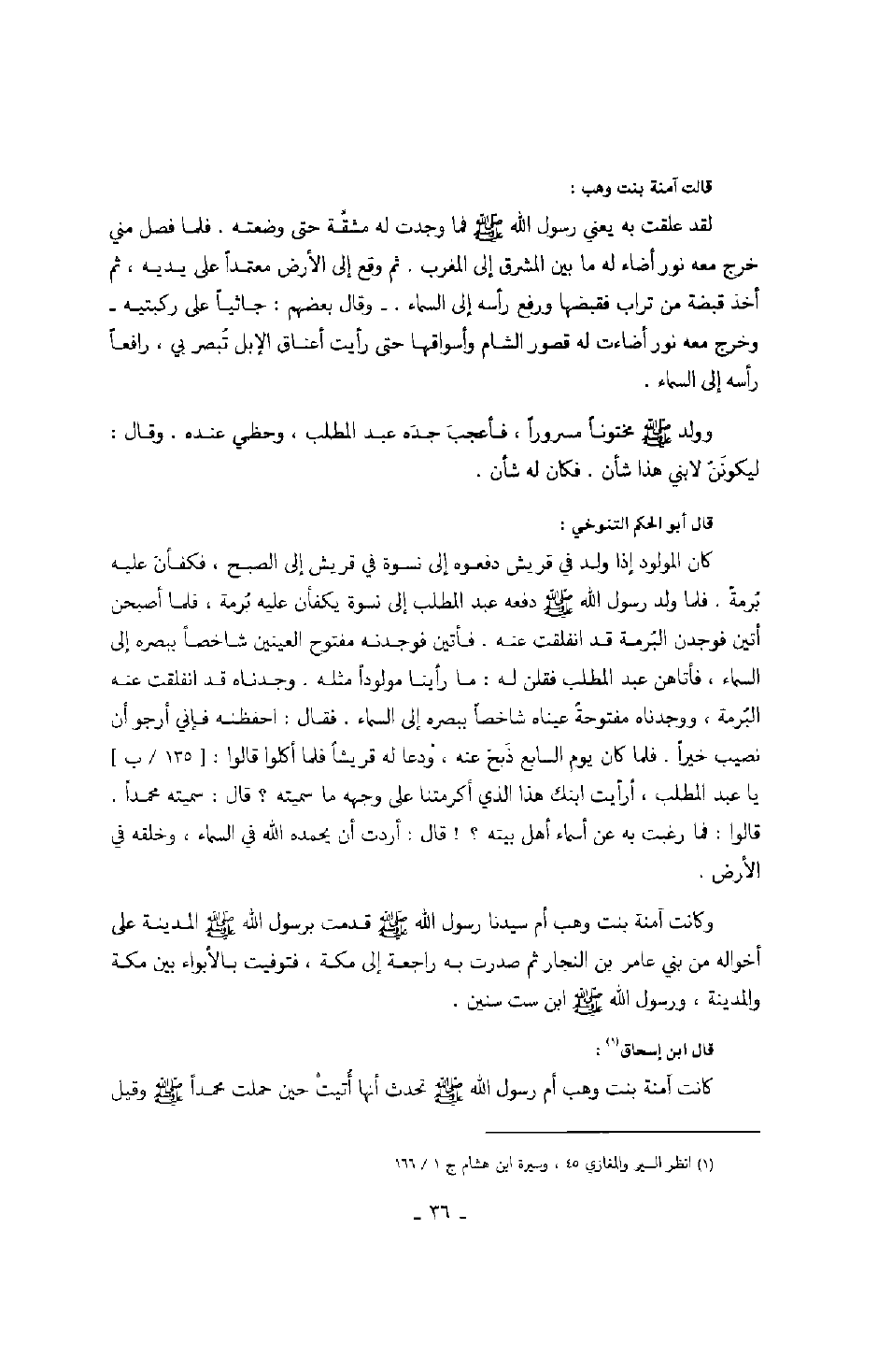 قالت آمنة بنت وهب: لقد علقت به يعني رسول الله صَلَّى اللهُ عَلَيْهِ وَسَلَّمَ فما وجدت له مشقة حتى وضعته. فلما فصل مني خرج معه نور أضاء له ما بين المشرق والمغرب. ثم وقع إلى الأرض معتمداً على يديه، ثم أخذ قبضة من تراب فقبضها ورفع رأسه إلى السماء. وقال بعضهم: جاثياً على ركبتيه وخرج معه نور أضاءت له قصور الشام وأسواقها حتى رأيت أعناق الإبل تبصر بي، رافعاً رأسه إلى السماء.