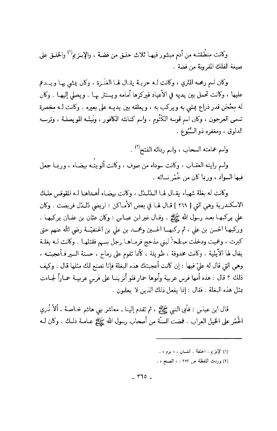 وكانت له بغلة شهباء يقال لها الدلدل، وكانت بيضاء أهداها له المقوس ملك الإسكندرية وهي التي قال لها في بعض الأماكن: اربضي دلدل فربضت. وكان علي يركبها بعد رسول الله صَلَّى اللهُ عَلَيْهِ وَسَلَّمَ. وقال غير ابن عباس: وكان عثمان بن عفان يركبها. وركبها الحسن بن علي، ثم ركبها الحسين ومحمد بن علي بن الحنفية رضي الله عنهم حتى كبرت، وعميت ودخلت مبطحة لبني مذحج فرماها رجل بسهم فقتلها. وكانت له بغلة يقال لها الأيلية. وكانت مخدوفة، طويلة، كأنما تقوم على رماه، حسنة السير فأعجبته، وهي التي قال له علي فيها: إن كانت أعجبتك هذه البغلة فإنا نصنع لك مثلها قال: وكيف ذلك؟ قال: هذه أمها فرس عربية وأبوها حمار فلو أنزينا على فرس عربية حماراً لجاءت بمثل هذه البغلة. فقال: إنما يفعل ذلك الذين لا يعلمون. قال ابن عباس: فأبى النبي صَلَّى اللهُ عَلَيْهِ وَسَلَّمَ، ثم تقدم إلينا - معاشر بني هاشم خاصة - ألا نزي الحمر على الخيل العراب. فمضت السنة من أصحاب رسول الله صَلَّى اللهُ عَلَيْهِ وَسَلَّمَ عامة ذلك. وكان له