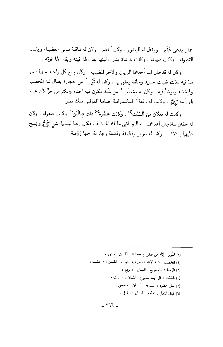 حمار يدعىعفير، ويقال له اليعفور. وكان أخضر. وكان له ناقة تسمى العضباء ويقال القصواء. وكانت صهباء. وكانت له شاة يشرب لبنها يقال لها غيثة ويقال لها غوثة. وكان له قدحان اسم أحدهما الريان والآخر المضبب، وكان يسع كل واحد منها قدر مدّ فيه ثلاث ضبات حديد وحلقة يعلق بها. وكان له تور من حجارة يقال له المخضب والمخضد يتوضأ فيه. وكان له مخضب من شبه يكون فيه الحناء والكتم من حر كان يجده في رأسه صَلَّى اللهُ عَلَيْهِ وَسَلَّمَ. وكانت له ربعة اسكندرانية أهداها المقوقس ملك مصر. وكانت له نعلان من السبت. وكانت مخصرة ذات قبالين وكانت صفراء. وكان له خفان ساذجان أهداهما له النجاشي ملك الحبشة، فكان ربما لبسهما النبي صَلَّى اللهُ عَلَيْهِ وَسَلَّمَ ويمسح عليهما. وكان له سرير وقطيفة وقصعة وجارية اسمها روضة.