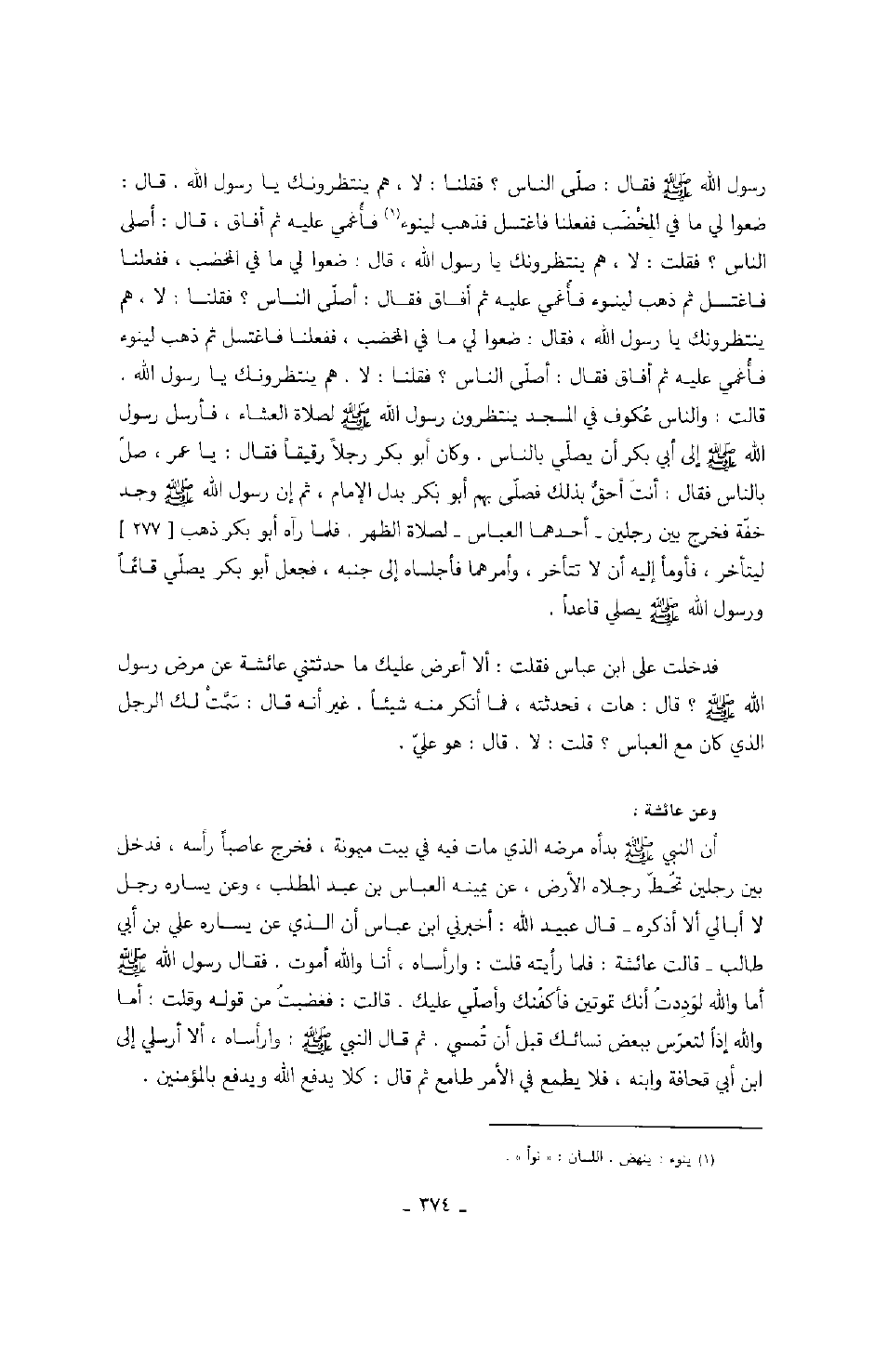 فقال: صلى الناس؟ فقلنا: لا، هم ينتظرونك يا رسول الله. قال: ضعوا لي ما في المخطب. ففعلنا فأغتسل ثم ذهب لينوء فإغمي عليه ثم أفاق: فقال أصلى الناس فقلت: لا. هم ينتظرونك يا رسول الله. قالت: والناس عكوف في المسجد ينتظرون رسول الله صَلَّى اللهُ عَلَيْهِ وَسَلَّمَ لصلاة العشاء، فأرسل رسول الله صَلَّى اللهُ عَلَيْهِ وَسَلَّمَ إلى أبي بكر أن يصلي بالناس. وكان أبو بكر رجلاً رقيقاً فقال: يا عمر صلي بالناس فقال: أنت أحق بذلك فصلى بهم أبو بكر بدل الإمام، ثم إن رسول الله صَلَّى اللهُ عَلَيْهِ وَسَلَّمَ وجد خفة فخرج بين رجلين أحدهما العباس لصلاة الظهر، فلما رآه أبو بكر ذهب ليتأخر، فأوما إليه أن لا تتأخر، وأمرهما فأجلساه إلى جنبه، فجعل أبو بكر يصلي قائماً ورسول الله صَلَّى اللهُ عَلَيْهِ وَسَلَّمَ يصلي قاعداً. فدخلت على ابن عباس فقلت: ألا أعرض عليك ما حدثتني عائشة عن مرض رسول الله صَلَّى اللهُ عَلَيْهِ وَسَلَّمَ؟ قال: هات، فحدثته، فما أنكر منه شيئاً. غير أنه قال: سمت لك الرجل الذي كان مع العباس. قلت لا قال هو علي. وعن عائشة: أن النبي صَلَّى اللهُ عَلَيْهِ وَسَلَّمَ بدأ مرضه الذي مات فيه في بيت ميمونة، فخرج عاصباً رأسه، فدخل بين رجلين تحط رجلاه الأرض، عن يمينه العباس بن عبد المطلب، وعن يساره رجل لا أبالي ألا أذكره - قال عبيد الله: أخبرني ابن عباس أن الذي علي يساره علي بن أبي طالب - قالت عائشة: قلما رأيته قلت: وارأساه، أنا والله أموت. فقال رسول الله صَلَّى اللهُ عَلَيْهِ وَسَلَّمَ أما والله لوددت أنك تموتين فأكفنك وأصلي عليك. قالت: فغضبت من قوله وقلت: أما والله إذاً لتعرس ببعض نسائك فبل أن تمسي. ثم قال النبي صَلَّى اللهُ عَلَيْهِ وَسَلَّمَ وارأساه، ألا